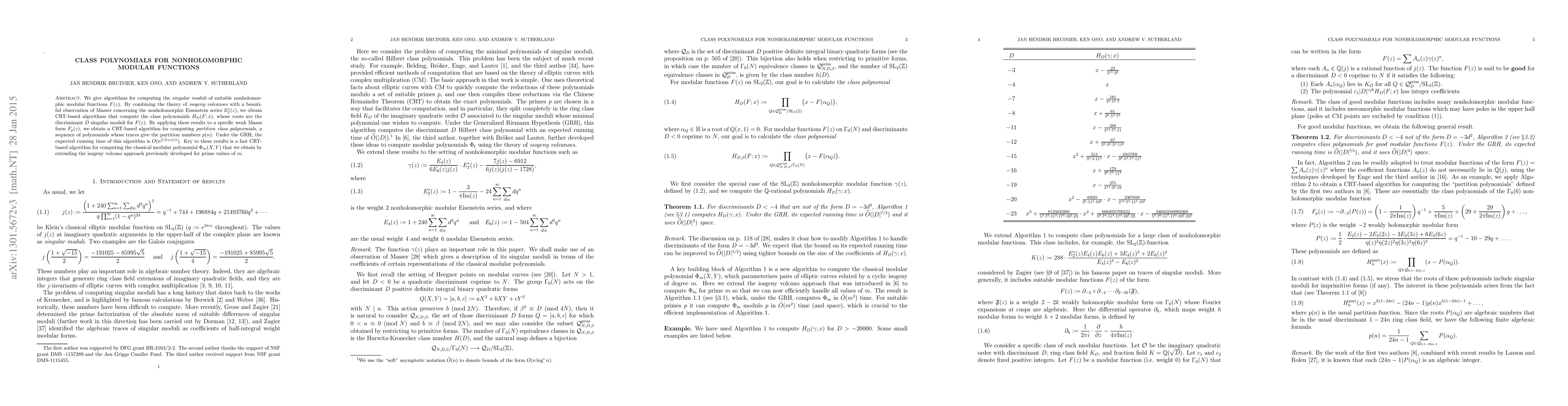 This paper presents algorithms for computing singular moduli of nonholomorphic modular functions using class polynomials and combines isogeny volcanoes with Masser's observation on nonholomorphic Eisenstein series. It also introduces a CRT-based algorithm for computing partition class polynomials, with an expected running time of O(n^{5/2+o(1)}) under the Generalized Riemann Hypothesis.