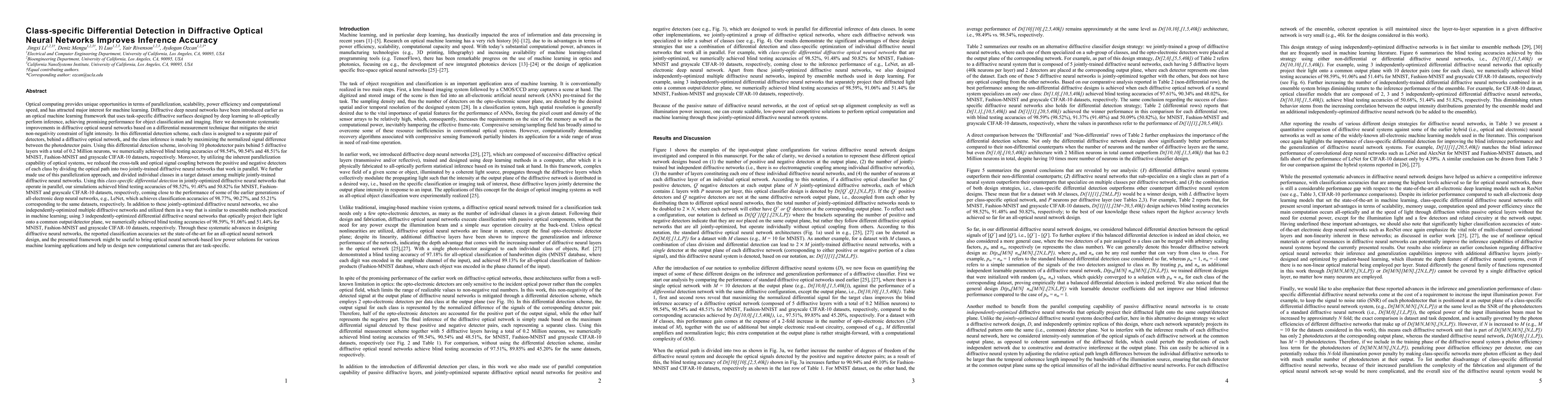 This paper introduces a class-specific differential detection technique in diffractive optical neural networks to enhance inference accuracy, achieving state-of-the-art classification accuracies for MNIST, Fashion-MNIST, and grayscale CIFAR-10 datasets. The method involves parallelizing diffractive networks and optimizing them jointly to maximize signal differences between detector pairs for each class.