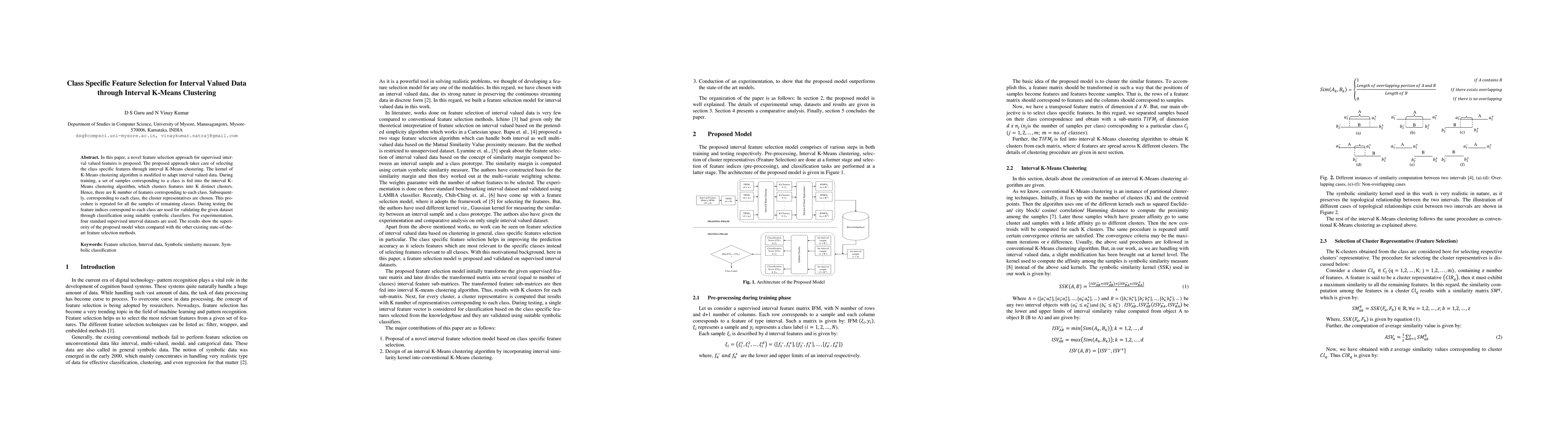 This paper proposes a novel feature selection method for interval valued data using interval K-Means clustering, which identifies class-specific features by clustering features into K distinct groups for each class. The method outperforms existing state-of-the-art techniques on four standard datasets.