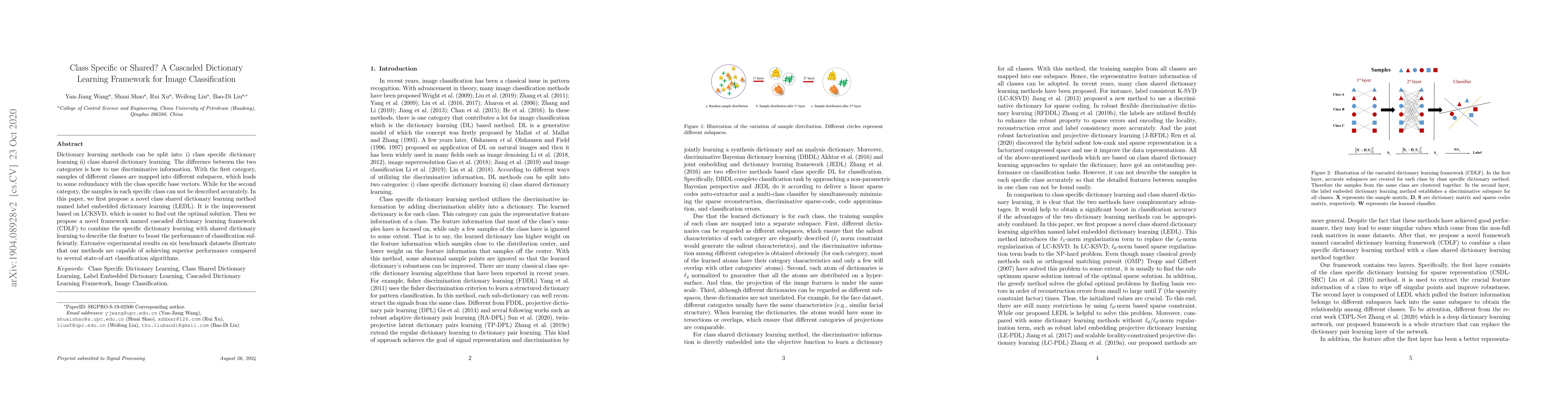 This paper presents a novel cascaded dictionary learning framework combining class-specific and shared dictionary learning to enhance image classification. The proposed label embedded dictionary learning (LEDL) method and the cascaded dictionary learning framework (CDLF) achieve superior performance over state-of-the-art algorithms on six benchmark datasets.