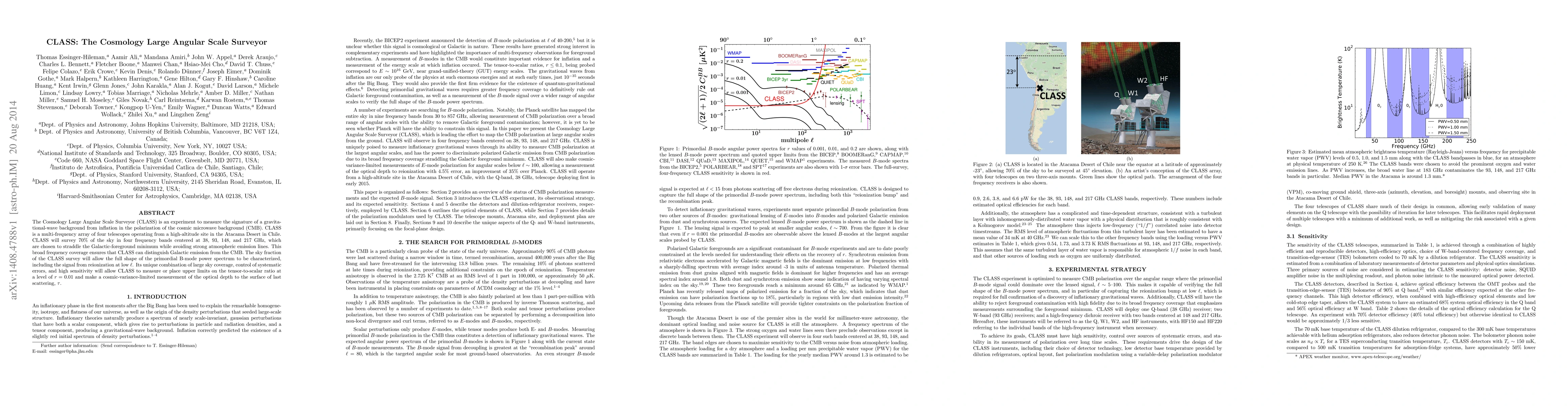 The Cosmology Large Angular Scale Surveyor (CLASS) aims to detect gravitational-wave background from inflation via CMB polarization. Operating in the Atacama Desert, CLASS will survey 70% of the sky across four frequency bands to distinguish CMB from Galactic emission, aiming to measure the tensor-to-scalar ratio at $r=0.01$ and determine the optical depth to the surface of last scattering.