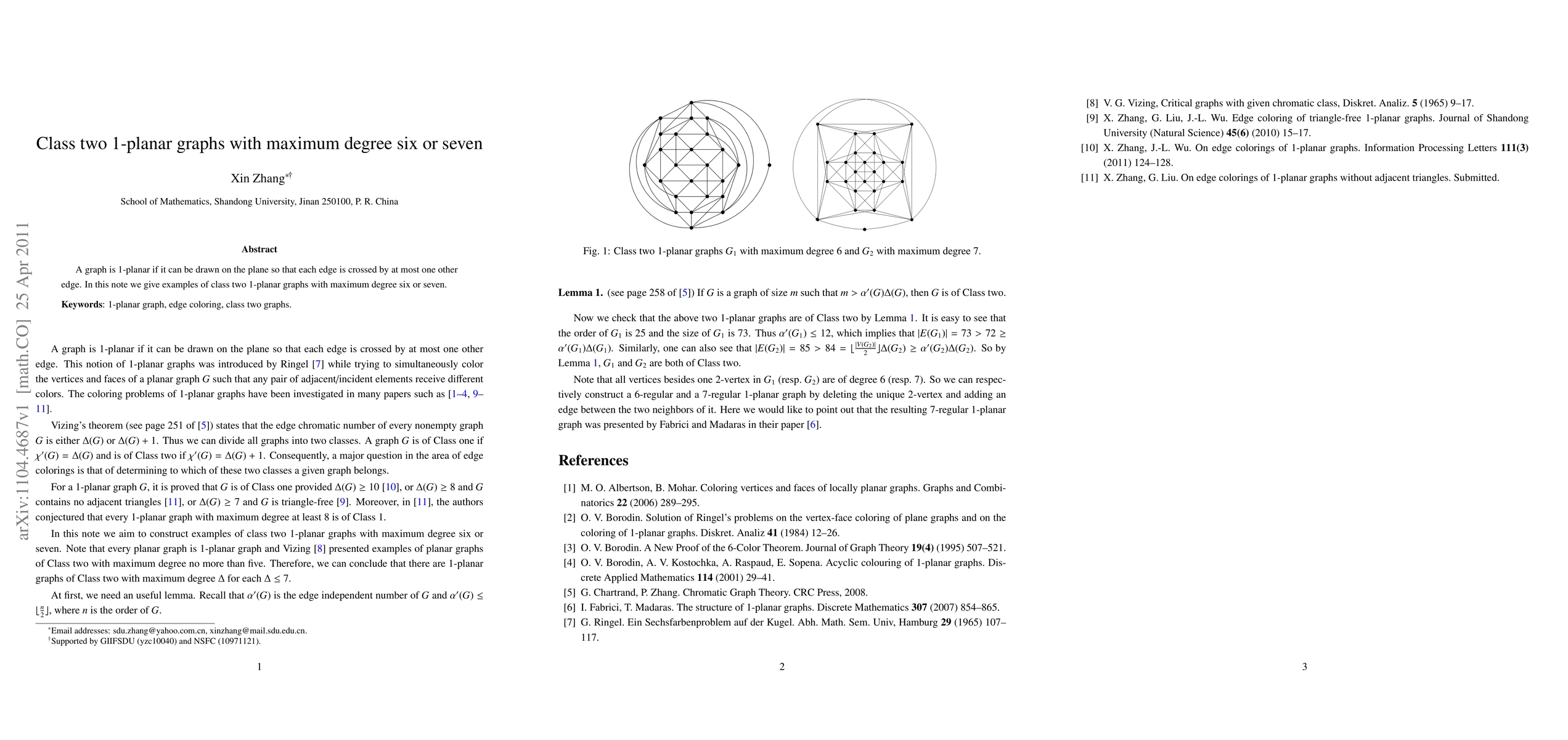 This paper explores class two 1-planar graphs, providing examples where each graph has a maximum degree of six or seven, and each edge is crossed by at most one other edge when drawn on a plane. The study focuses on the structural properties of these specific 1-planar graphs.