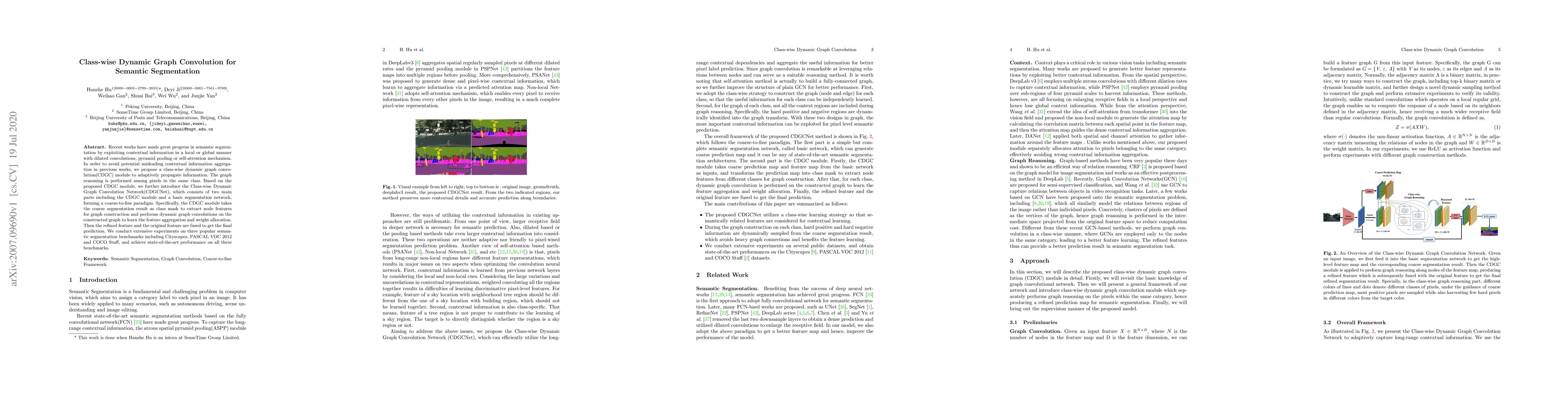 This paper proposes a Class-wise Dynamic Graph Convolution (CDGC) module to adaptively propagate contextual information among pixels of the same class, avoiding misleading aggregation. The CDGCNet, integrating this module with a basic segmentation network, achieves state-of-the-art performance on Cityscapes, PASCAL VOC 2012, and COCO Stuff benchmarks.