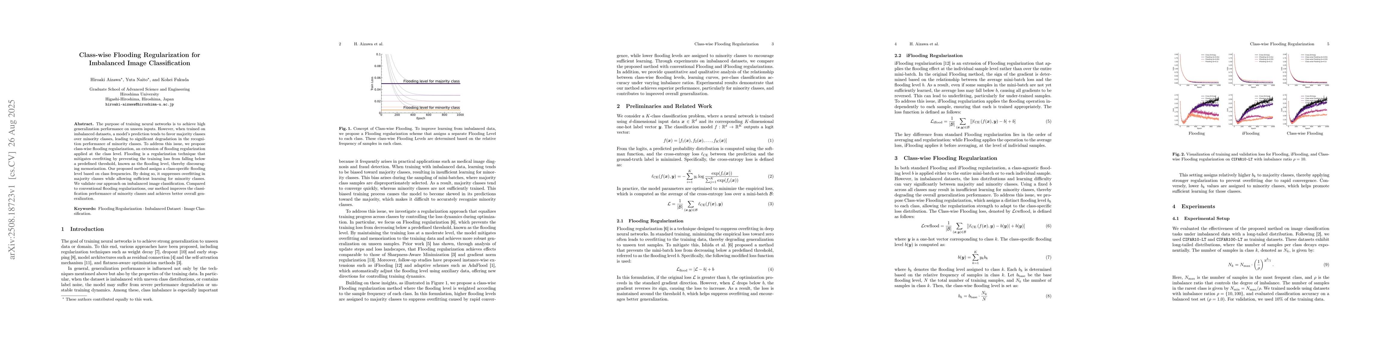 The purpose of training neural networks is to achieve high generalization performance on unseen inputs. However, when trained on imbalanced datasets, a model's prediction tends to favor majority classes over minority classes, leading to significant degradation in the recognition performance of minority classes. To address this issue, we propose class-wise flooding regularization, an extension of flooding regularization applied at the class level. Flooding is a regularization technique that mitigates overfitting by preventing the training loss from falling below a predefined threshold, known as the flooding level, thereby discouraging memorization. Our proposed method assigns a class-specific flooding level based on class frequencies. By doing so, it suppresses overfitting in majority classes while allowing sufficient learning for minority classes. We validate our approach on imbalanced image classification. Compared to conventional flooding regularizations, our method improves the classification performance of minority classes and achieves better overall generalization.