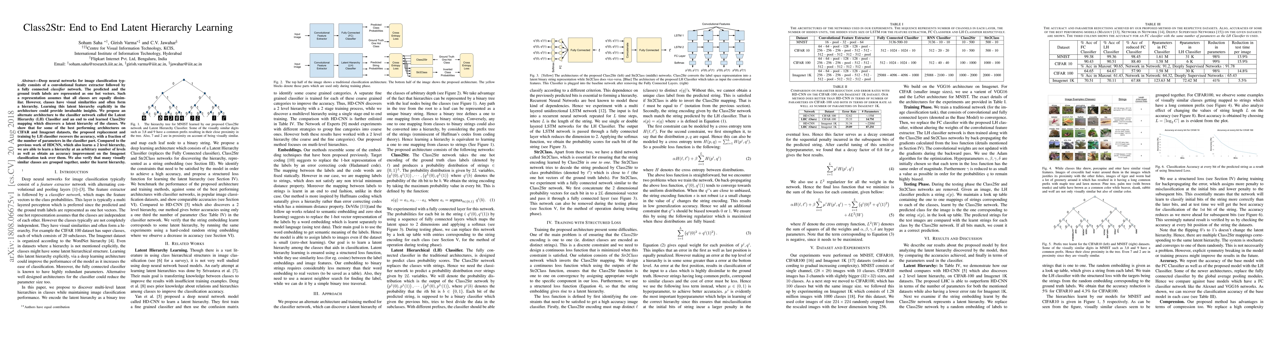 Deep neural networks for image classification typically consists of a convolutional feature extractor followed by a fully connected classifier network. The predicted and the ground truth labels are represented as one hot vectors. Such a representation assumes that all classes are equally dissimilar. However, classes have visual similarities and often form a hierarchy. Learning this latent hierarchy explicitly in the architecture could provide invaluable insights. We propose an alternate architecture to the classifier network called the Latent Hierarchy (LH) Classifier and an end to end learned Class2Str mapping which discovers a latent hierarchy of the classes. We show that for some of the best performing architectures on CIFAR and Imagenet datasets, the proposed replacement and training by LH classifier recovers the accuracy, with a fraction of the number of parameters in the classifier part. Compared to the previous work of HDCNN, which also learns a 2 level hierarchy, we are able to learn a hierarchy at an arbitrary number of levels as well as obtain an accuracy improvement on the Imagenet classification task over them. We also verify that many visually similar classes are grouped together, under the learnt hierarchy.