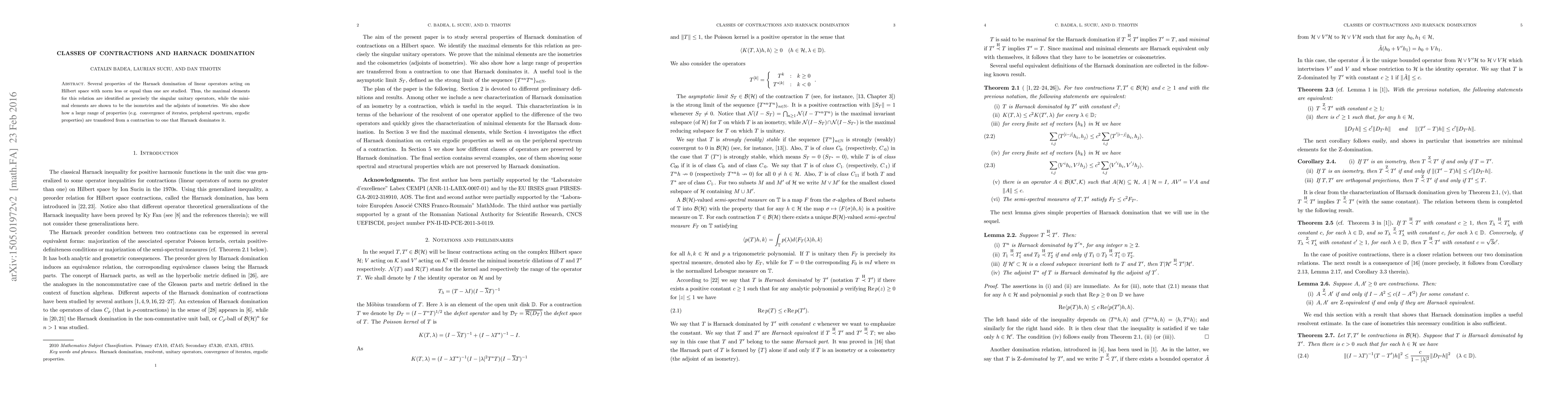 Several properties of the Harnack domination of linear operators acting on Hilbert space with norm less or equal than one are studied. Thus, the maximal elements for this relation are identified as precisely the singular unitary operators, while the minimal elements are shown to be the isometries and the adjoints of isometries. We also show how a large range of properties (e.g. convergence of iterates, peripheral spectrum, ergodic properties) are transfered from a contraction to one that Harnack dominates it.