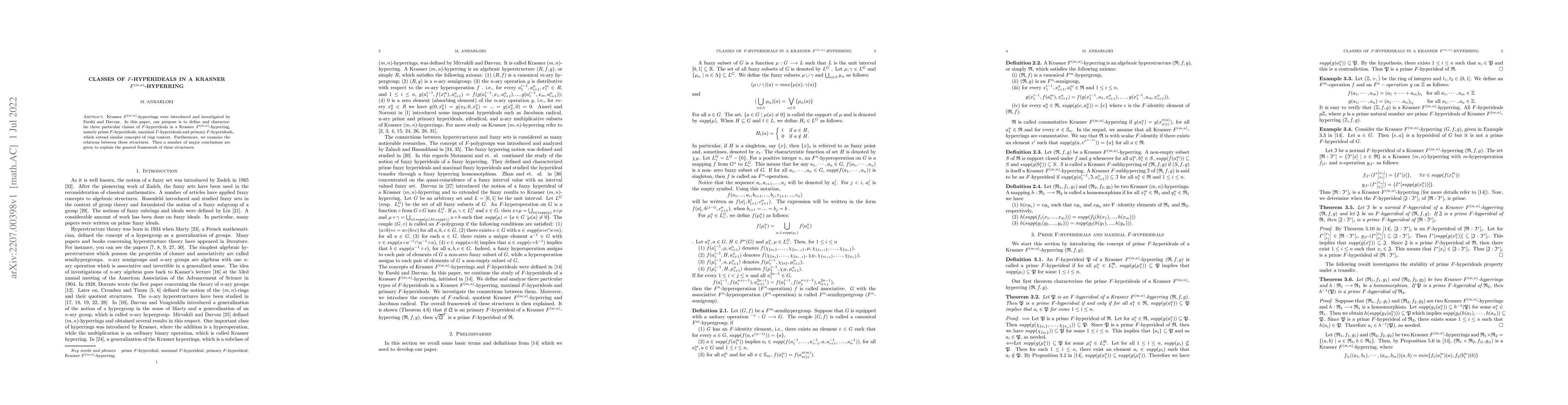 This paper defines and characterizes three classes of F-hyperideals in Krasner F^{(m,n)}-hyperrings: prime, maximal, and primary F-hyperideals. The study builds on the foundational work of Farshi and Davvaz in the field.