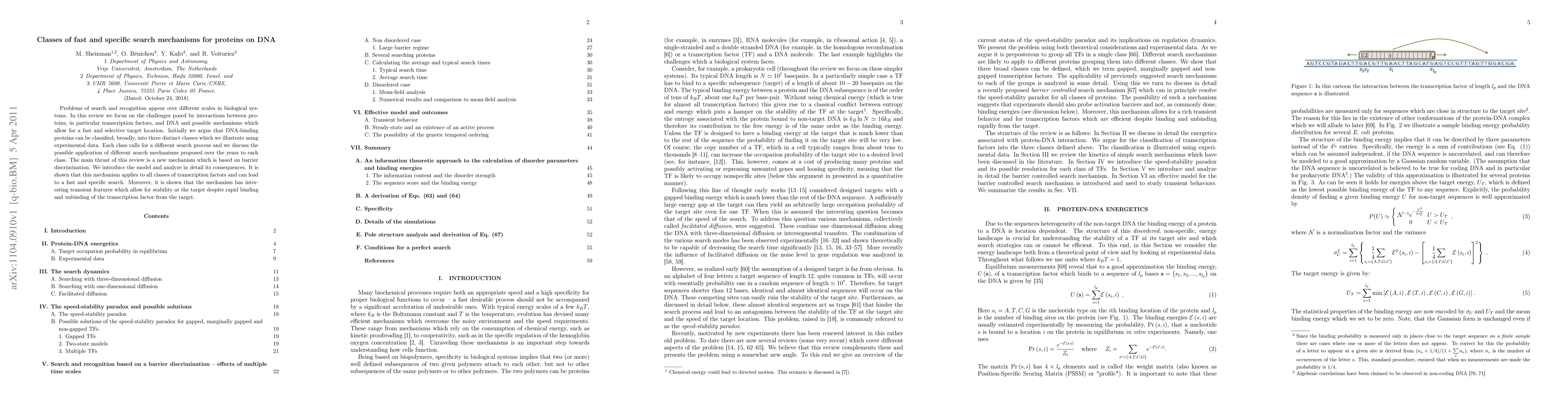 Problems of search and recognition appear over different scales in biological systems. In this review we focus on the challenges posed by interactions between proteins, in particular transcription factors, and DNA and possible mechanisms which allow for a fast and selective target location. Initially we argue that DNA-binding proteins can be classified, broadly, into three distinct classes which we illustrate using experimental data. Each class calls for a different search process and we discuss the possible application of different search mechanisms proposed over the years to each class. The main thrust of this review is a new mechanism which is based on barrier discrimination. We introduce the model and analyze in detail its consequences. It is shown that this mechanism applies to all classes of transcription factors and can lead to a fast and specific search. Moreover, it is shown that the mechanism has interesting transient features which allow for stability at the target despite rapid binding and unbinding of the transcription factor from the target.