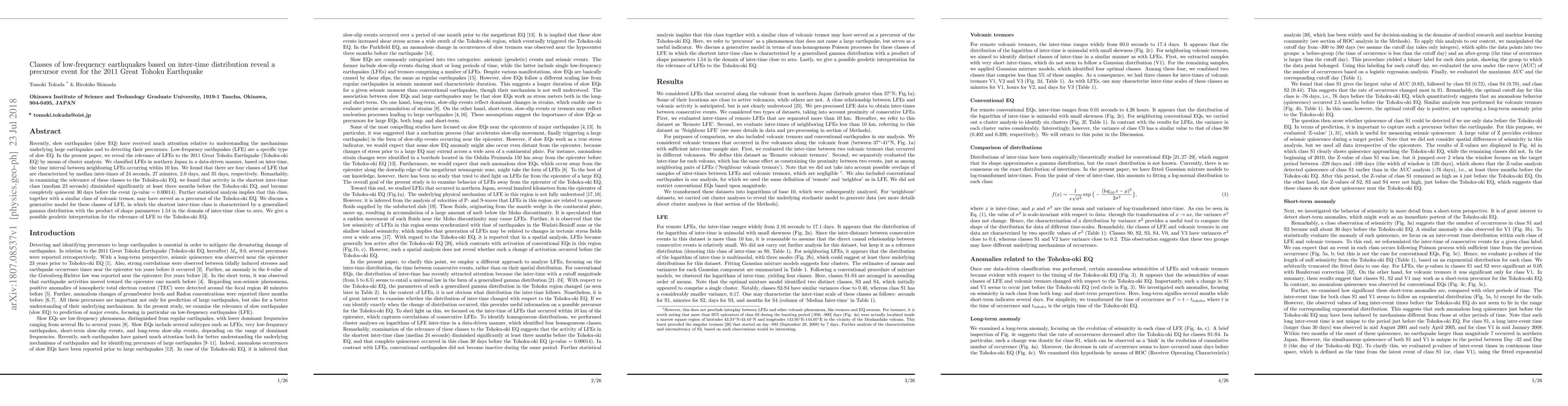 This paper classifies low-frequency earthquakes (LFE) in northern Japan into four classes based on inter-time intervals, finding that the shortest inter-time class significantly diminished three months before the 2011 Great Tohoku Earthquake, suggesting it may have served as a precursor. The study proposes a generative model and discusses a geodetic interpretation for these findings.