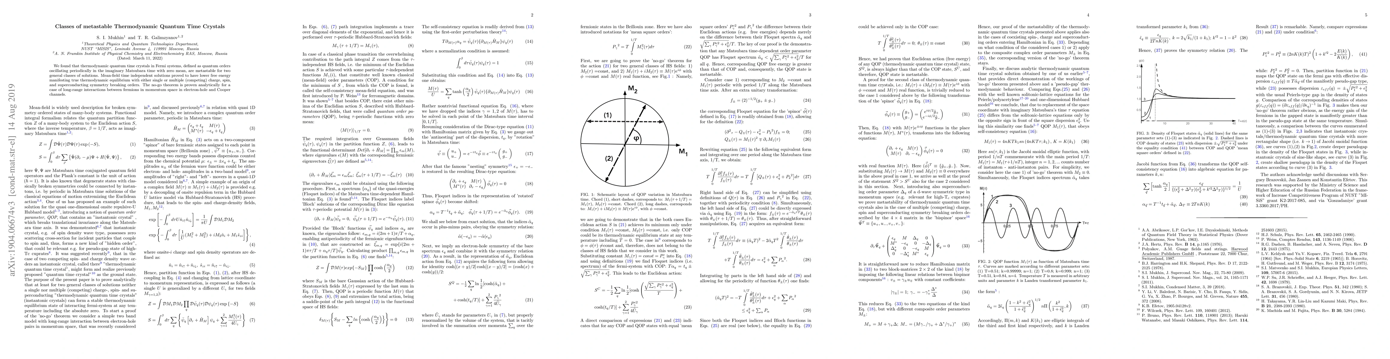 We found that thermodynamic quantum time crystals in fermi systems, defined as quantum orders oscillating periodically in the imaginary Matsubara time with zero mean, are metastable for two general classes of solutions. Mean-field time independent solutions proved to have lower free energy manifesting true thermodynamic equilibrium with either single or multiple (competing) charge, spin and superconducting symmetry breaking orders. The 'no-go' theorem is proven analytically for a case of long-range interactions between fermions in momentum space in electron-hole and Cooper channels.