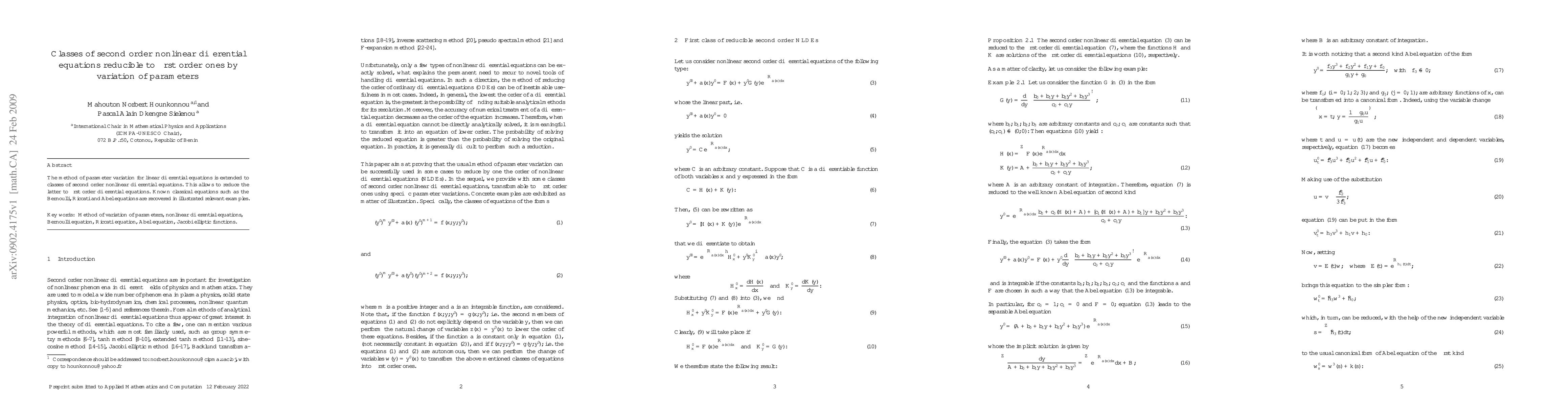 The paper extends the method of parameter variation to reduce certain classes of second order nonlinear differential equations to first order ones, illustrating the approach with classical equations like Bernoulli, Riccati, and Abel. The method provides a novel way to handle complex nonlinear differential equations.
