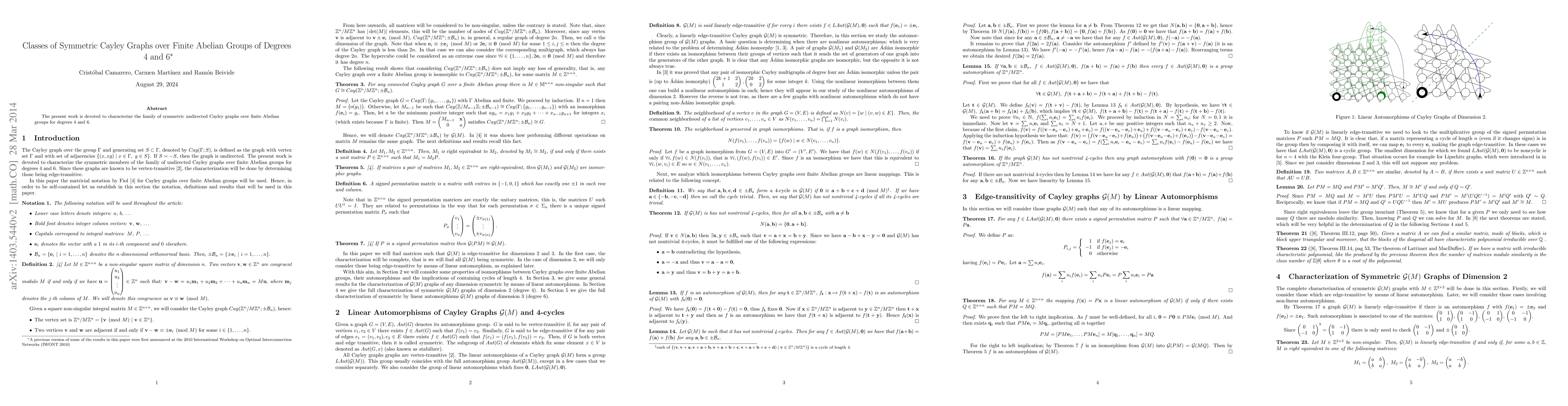 This paper characterizes the family of symmetric Cayley graphs over finite Abelian groups for degrees 4 and 6, focusing on their structural properties.