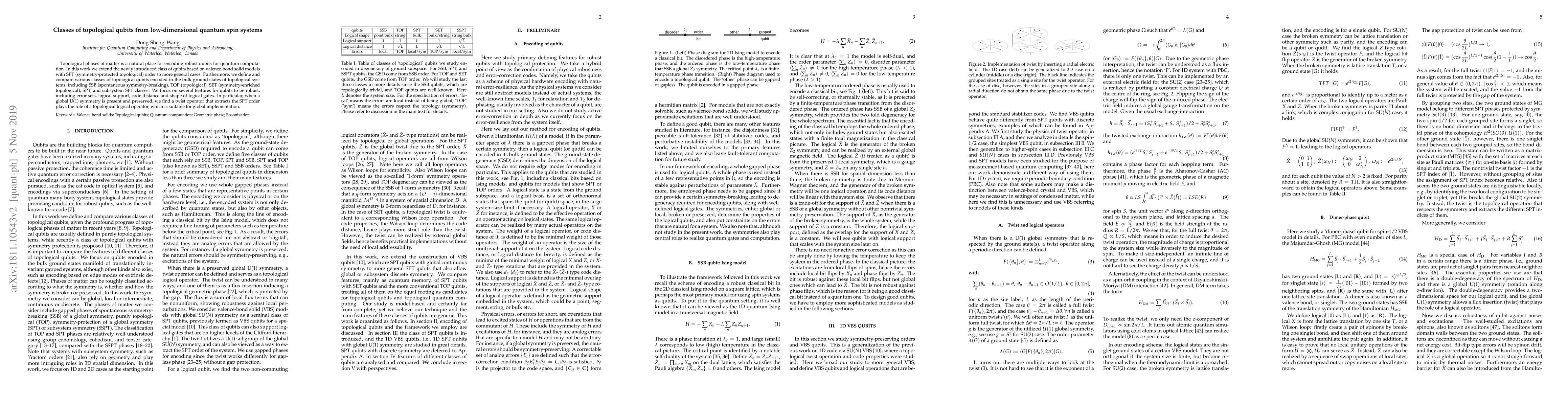 Topological phases of matter is a natural place for encoding robust qubits for quantum computation. In this work we extend the newly introduced class of qubits based on valence-bond solid models with SPT (symmetry-protected topological) order to more general cases. Furthermore, we define and compare various classes of topological qubits encoded in the bulk ground states of topological systems, including SSB (spontaneous symmetry-breaking), TOP (topological), SET (symmetry-enriched topological), SPT, and subsystem SPT classes. We focus on several features for qubits to be robust, including error sets, logical support, code distance and shape of logical gates. In particular, when a global U(1) symmetry is present and preserved, we find a twist operator that extracts the SPT order plays the role of a topological logical operator, which is suitable for global implementation.