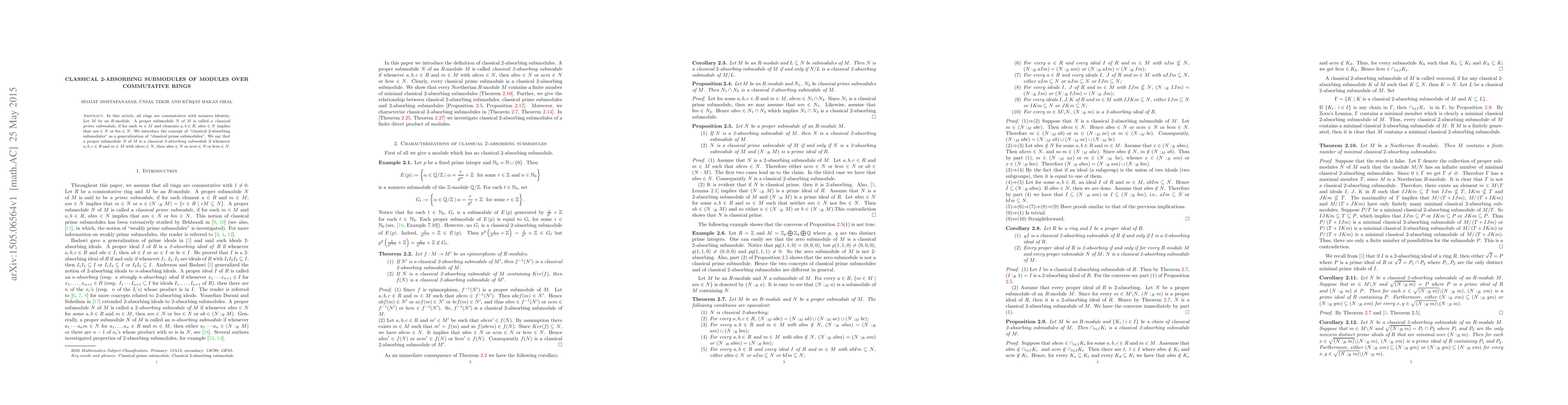 In this article, all rings are commutative with nonzero identity. Let $M$ be an $R$-module. A proper submodule $N$ of $M$ is called a classical prime submodule, if for each $m\in M$ and elements $a,b\in R$, $abm\in N$ implies that $am\in N$ or $bm\in N$. We introduce the concept of "classical 2-absorbing submodules" as a generalization of "classical prime submodules." We say that a proper submodule $N$ of $M$ is a classical 2-absorbing submodule if whenever $a,b,c\in R$ and $m\in M$ with $abcm\in N$, then $abm\in N$ or $acm\in N$ or $bcm\in N$.