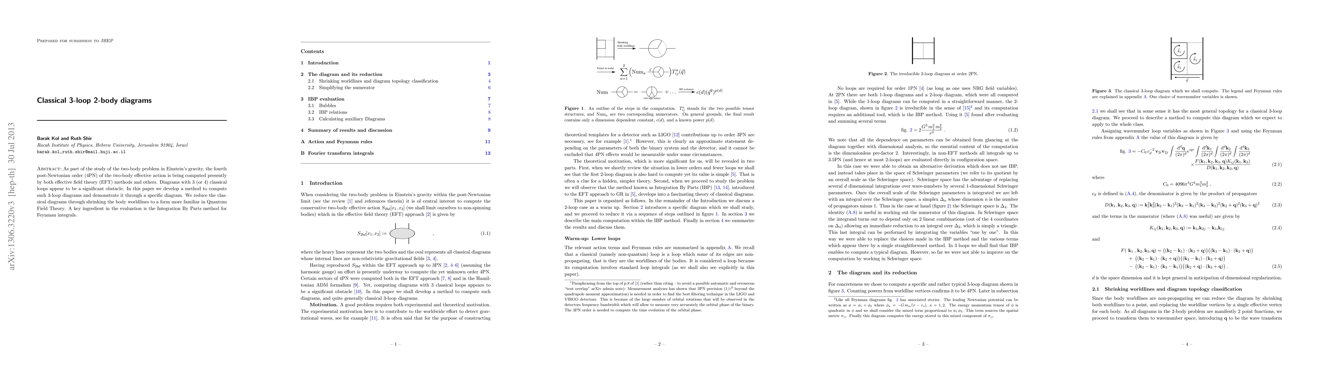 As part of the study of the two-body problem in Einstein's gravity, the fourth post-Newtonian order (4PN) of the two-body effective action is being computed presently by both effective field theory (EFT) methods and others. Diagrams with 3 (or 4) classical loops appear to be a significant obstacle. In this paper we develop a method to compute such 3-loop diagrams and demonstrate it through a specific diagram. We reduce the classical diagrams through shrinking the body worldlines to a form more familiar in Quantum Field Theory. A key ingredient in the evaluation is the Integration By Parts method for Feynman integrals.