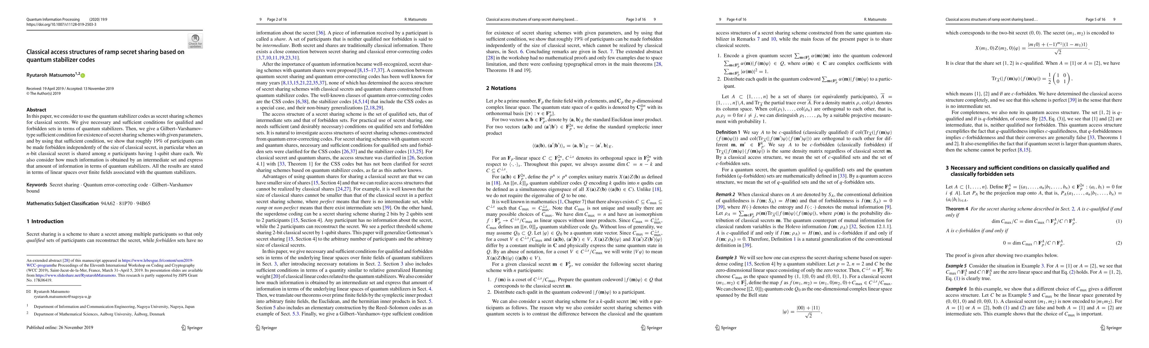 This paper explores quantum stabilizer codes for classical secret sharing, establishing conditions for qualified and forbidden sets. It demonstrates that approximately 19% of participants can be forbidden regardless of the secret size, and quantifies the information obtained by intermediate sets in terms of quantum stabilizers.