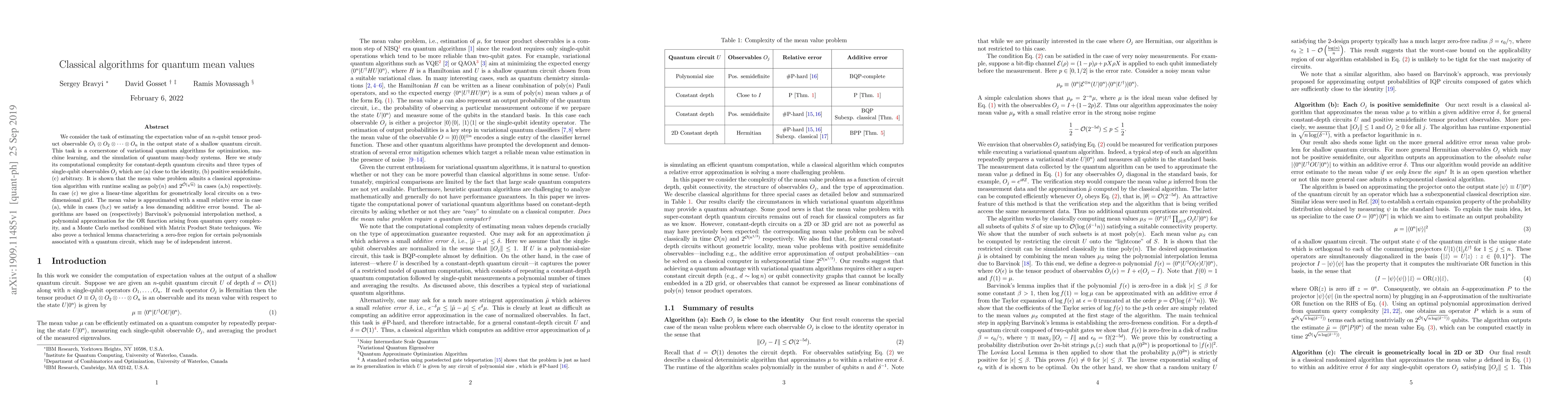 We consider the task of estimating the expectation value of an $n$-qubit tensor product observable $O_1\otimes O_2\otimes \cdots \otimes O_n$ in the output state of a shallow quantum circuit. This task is a cornerstone of variational quantum algorithms for optimization, machine learning, and the simulation of quantum many-body systems. Here we study its computational complexity for constant-depth quantum circuits and three types of single-qubit observables $O_j$ which are (a) close to the identity, (b) positive semidefinite, (c) arbitrary. It is shown that the mean value problem admits a classical approximation algorithm with runtime scaling as $\mathrm{poly}(n)$ and $2^{\tilde{O}(\sqrt{n})}$ in cases (a,b) respectively. In case (c) we give a linear-time algorithm for geometrically local circuits on a two-dimensional grid. The mean value is approximated with a small relative error in case (a), while in cases (b,c) we satisfy a less demanding additive error bound. The algorithms are based on (respectively) Barvinok's polynomial interpolation method, a polynomial approximation for the OR function arising from quantum query complexity, and a Monte Carlo method combined with Matrix Product State techniques. We also prove a technical lemma characterizing a zero-free region for certain polynomials associated with a quantum circuit, which may be of independent interest.