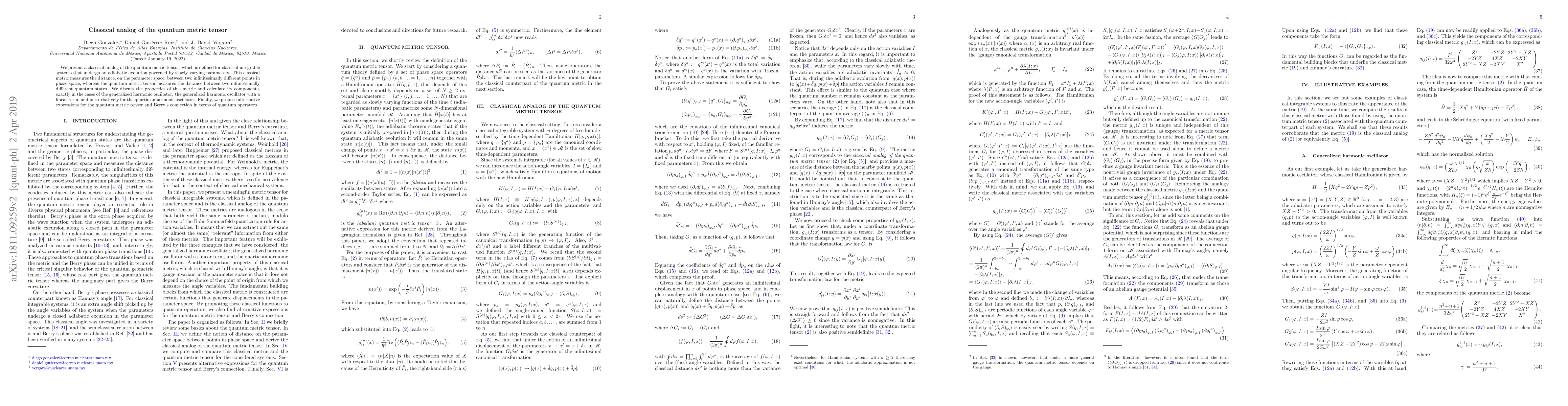 We present a classical analog of the quantum metric tensor, which is defined for classical integrable systems that undergo an adiabatic evolution governed by slowly varying parameters. This classical metric measures the distance, on the parameter space, between two infinitesimally different points in phase space, whereas the quantum metric tensor measures the distance between two infinitesimally different quantum states. We discuss the properties of this metric and calculate its components, exactly in the cases of the generalized harmonic oscillator, the generalized harmonic oscillator with a linear term, and perturbatively for the quartic anharmonic oscillator. Finally, we propose alternative expressions for the quantum metric tensor and Berry's connection in terms of quantum operators.