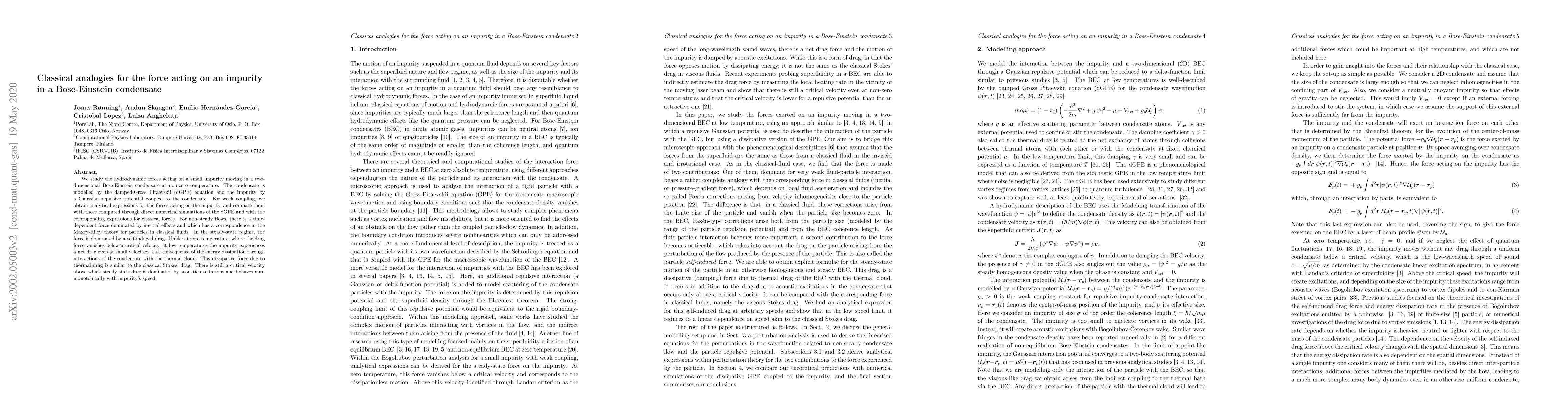 This paper investigates hydrodynamic forces on an impurity in a two-dimensional Bose-Einstein condensate using the damped-Gross Pitaevskii equation, revealing analytical expressions for forces that correspond to classical Maxey-Riley theory for inertial effects. It finds that low temperatures induce a net drag similar to classical Stokes' drag, even at small impurity velocities, due to thermal interactions.