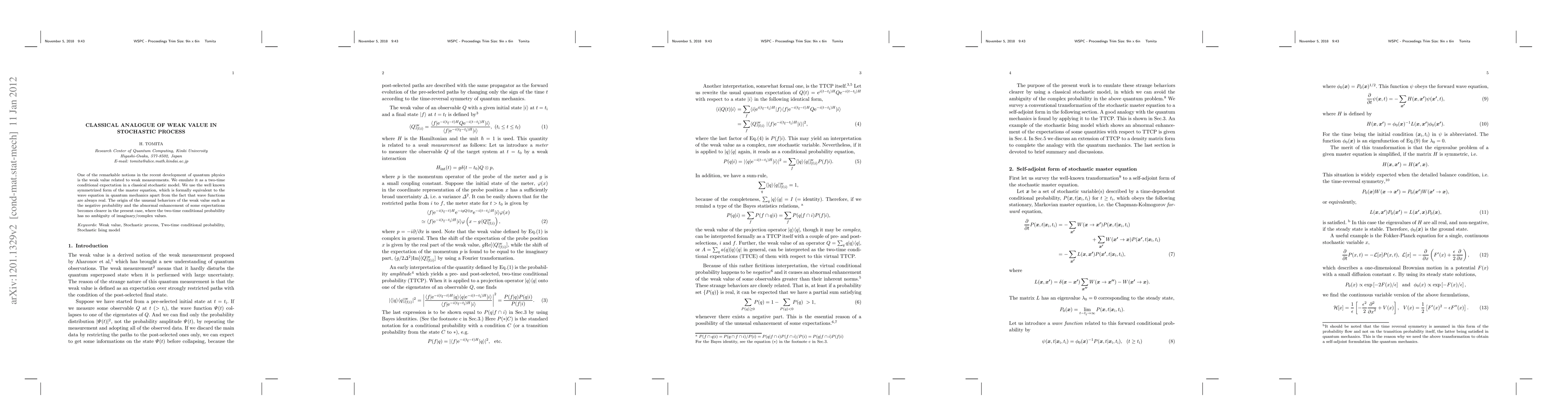 One of the remarkable notions in the recent development of quantum physics is the weak value related to weak measurements. We emulate it as a two-time conditional expectation in a classical stochastic model. We use the well known symmetrized form of the master equation, which is formally equivalent to the wave equation in quantum mechanics apart from the fact that wave functions are always real. The origin of the unusual behaviors of the weak value such as the negative probability and the abnormal enhancement of some expectations becomes clearer in the present case, where the two-time conditional probability has no ambiguity of imaginary/complex values.