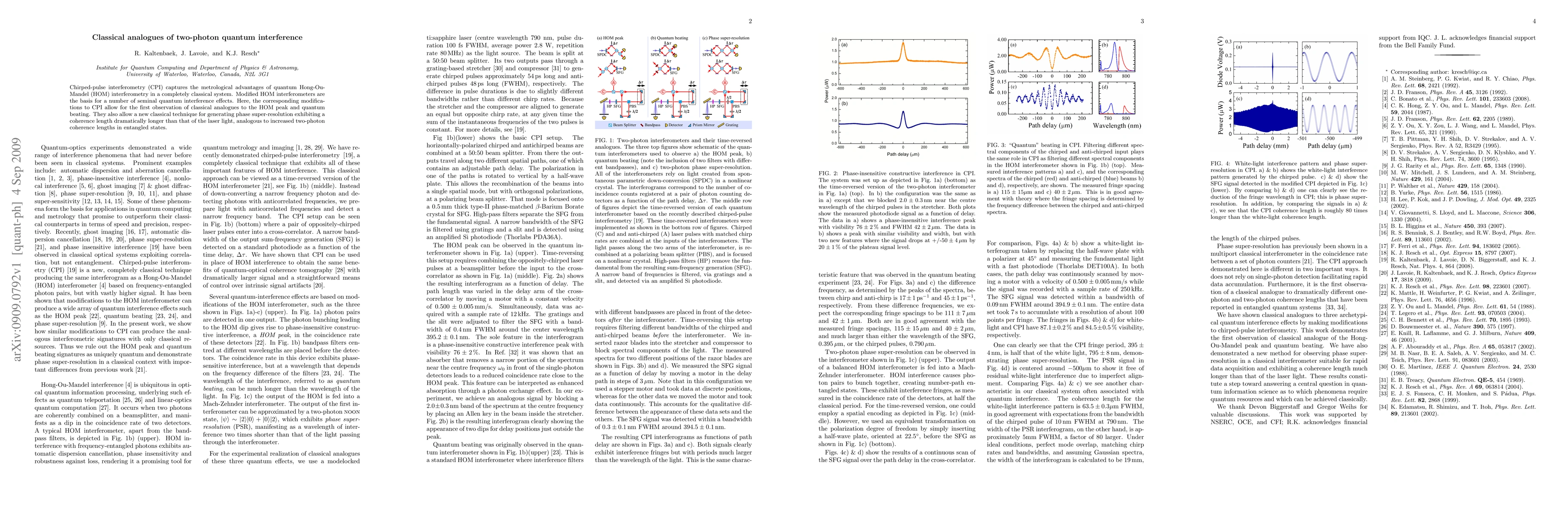 Chirped-pulse interferometry (CPI) captures the metrological advantages of quantum Hong-Ou-Mandel (HOM) interferometry in a completely classical system. Modified HOM interferometers are the basis for a number of seminal quantum-interference effects. Here, the corresponding modifications to CPI allow for the first observation of classical analogues to the HOM peak and quantum beating. They also allow a new classical technique for generating phase super-resolution exhibiting a coherence length dramatically longer than that of the laser light, analogous to increased two-photon coherence lengths in entangled states.