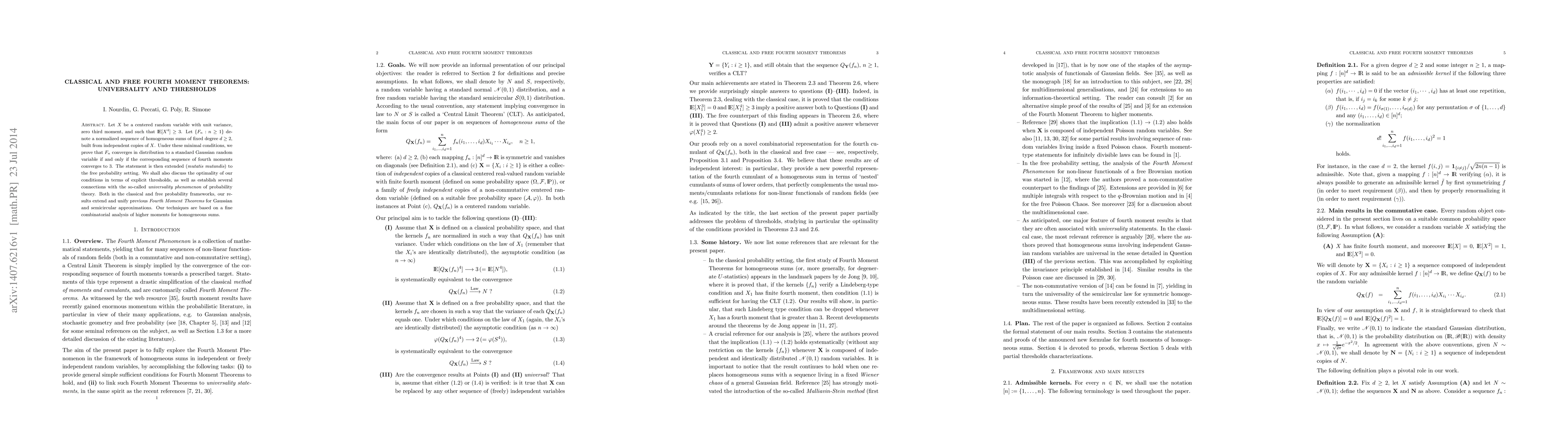 This paper proves that for a centered random variable $X$ with unit variance and $E[X^4] \ge 3$, the normalized sum $F_n$ converges to a Gaussian if and only if its fourth moments converge to $3$. The results extend to free probability settings and discuss optimality and universality in both frameworks.