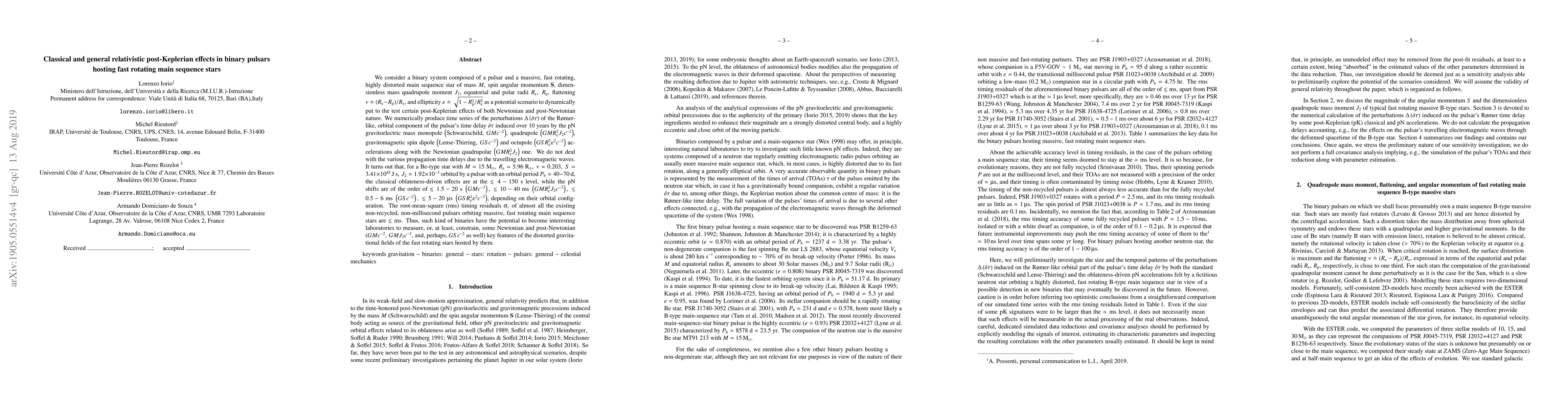 We consider a binary system composed of a pulsar and a massive, fast rotating, highly distorted main sequence star as a potential scenario to dynamically put to the test certain post-Keplerian effects of both Newtonian and post-Newtonian nature. We numerically produce time series of the perturbations $\Delta\left(\delta\tau\right)$ of the R{\o}mer-like, orbital component of the pulsar's time delay $\delta\tau$ induced over 10 years by the pN gravitoelectric mass monopole, quadrupole, gravitomagnetic spin dipole and octupole accelerations along with the Newtonian quadrupolar one. We do not deal with the various propagation time delays due to the travelling electromagnetic waves. It turns out that, for a Be-type star with $M = 15\ \textrm{M}_\odot$, $R_\textrm{e} = 5.96\ \textrm{R}_\odot$, $\nu = 0.203$, $S = 3.41\times 10^{45}\ \textrm{J}\ \textrm{s}$, $J_2 = 1.92\times 10^{-3}$ orbited by a pulsar with an orbital period $P_\textrm{b}\simeq 40-70\ \textrm{d}$, the classical oblateness-driven effects are at the $\lesssim 4-150\ \textrm{s}$ level, while the pN shifts are of the order of $\lesssim 1.5-20\ \textrm{s}\ \left(GMc^{-2}\right)$, $\lesssim 10-40\ \textrm{ms}\ \left(GMR^2_\textrm{e} J_2 c^{-2}\right)$, $\lesssim 0.5 - 6\ \textrm{ms}\ \left(GSc^{-2}\right)$, $\lesssim 5 - 20\ \mu\textrm{s}\ \left(GSR^2_\textrm{e} \varepsilon^2 c^{-2}\right)$, depending on their orbital configuration. The root-mean-square (rms) timing residuals $\sigma_{\tau}$ of almost all the existing non-recycled, non-millisecond pulsars orbiting massive, fast rotating main sequence stars are $\lesssim\textrm{ms}$. Thus, such kind of binaries have the potential to become interesting laboratories to measure, or, at least, constrain, some Newtonian and post-Newtonian key features of the distorted gravitational fields of the fast rotating stars hosted by them [Abridged].