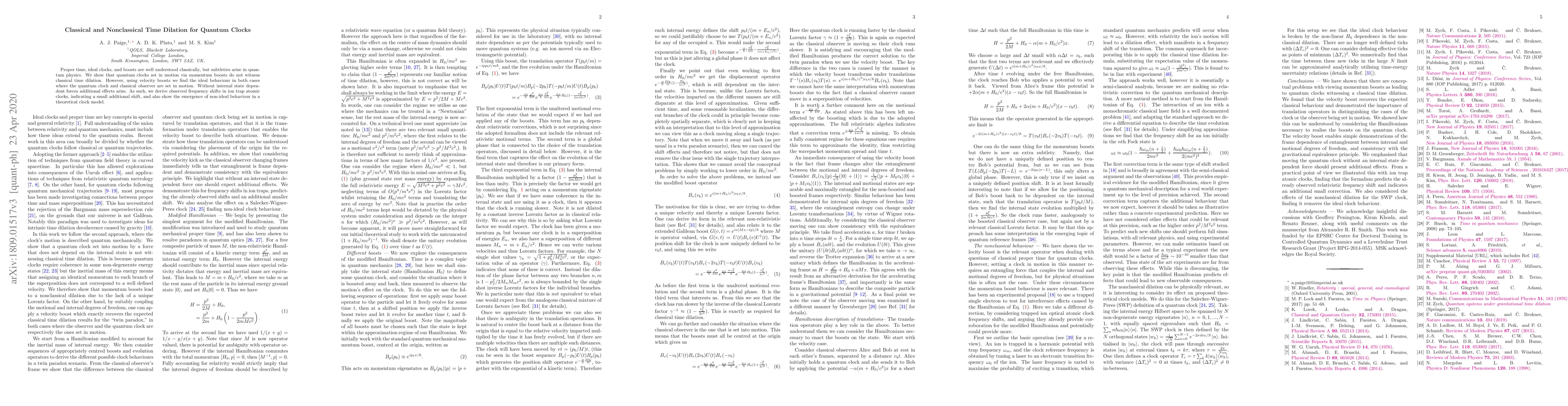 Proper time, ideal clocks, and boosts are well understood classically, but subtleties arise in quantum physics. We show that quantum clocks set in motion via momentum boosts do not witness classical time dilation. However, using velocity boosts we find the ideal behaviour in both cases where the quantum clock and classical observer are set in motion. Without internal state dependent forces additional effects arise. As such, we derive observed frequency shifts in ion trap atomic clocks, indicating a small additional shift, and also show the emergence of non-ideal behaviour in a theoretical clock model.