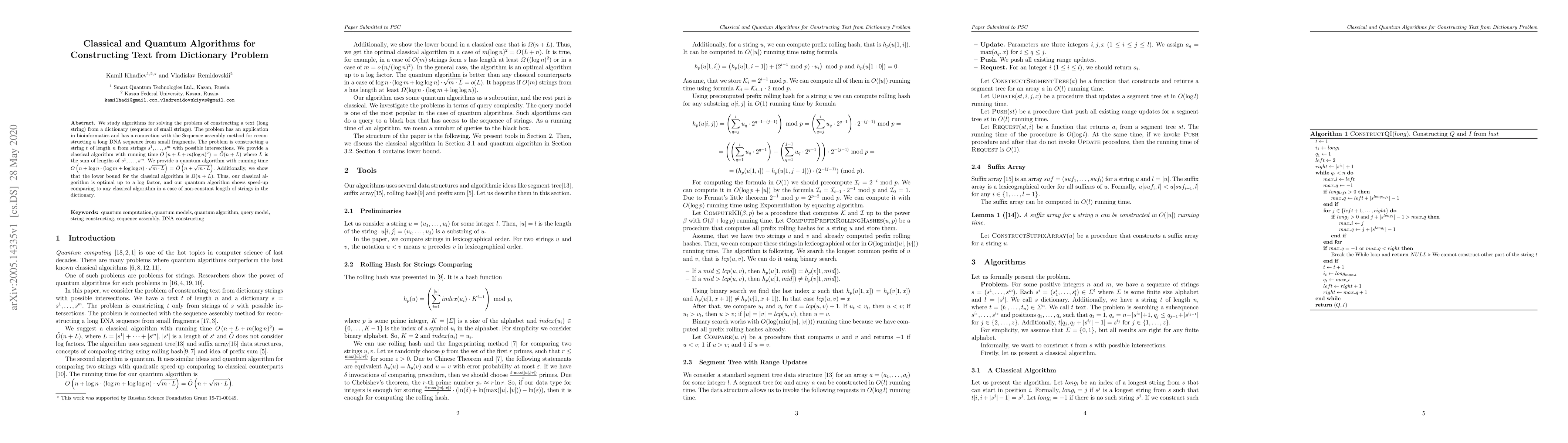 We study algorithms for solving the problem of constructing a text (long string) from a dictionary (sequence of small strings). The problem has an application in bioinformatics and has a connection with the Sequence assembly method for reconstructing a long DNA sequence from small fragments. The problem is constructing a string $t$ of length $n$ from strings $s^1,\dots, s^m$ with possible intersections. We provide a classical algorithm with running time $O\left(n+L +m(\log n)^2\right)=\tilde{O}(n+L)$ where $L$ is the sum of lengths of $s^1,\dots,s^m$. We provide a quantum algorithm with running time $O\left(n +\log n\cdot(\log m+\log\log n)\cdot \sqrt{m\cdot L}\right)=\tilde{O}\left(n +\sqrt{m\cdot L}\right)$. Additionally, we show that the lower bound for the classical algorithm is $\Omega(n+L)$. Thus, our classical algorithm is optimal up to a log factor, and our quantum algorithm shows speed-up comparing to any classical algorithm in a case of non-constant length of strings in the dictionary.
