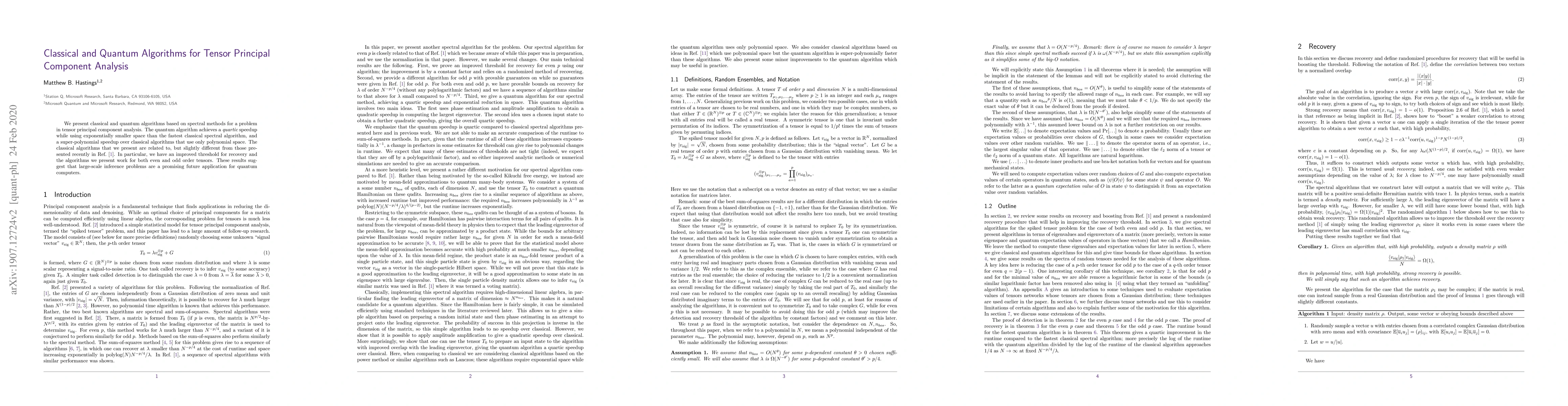 This paper introduces classical and quantum algorithms for tensor principal component analysis, achieving a quartic speedup and exponentially smaller space usage for the quantum algorithm compared to the fastest classical spectral method. The classical algorithms offer improved recovery thresholds and work for both even and odd order tensors, suggesting potential for quantum computers in large-scale inference.