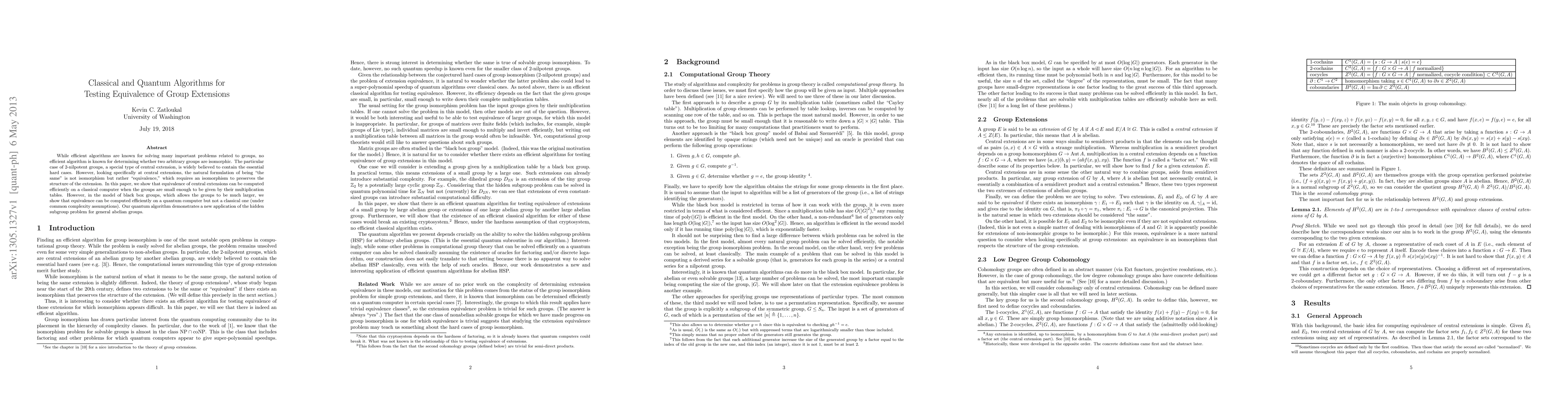 While efficient algorithms are known for solving many important problems related to groups, no efficient algorithm is known for determining whether two arbitrary groups are isomorphic. The particular case of 2-nilpotent groups, a special type of central extension, is widely believed to contain the essential hard cases. However, looking specifically at central extensions, the natural formulation of being "the same" is not isomorphism but rather "equivalence," which requires an isomorphism to preserves the structure of the extension. In this paper, we show that equivalence of central extensions can be computed efficiently on a classical computer when the groups are small enough to be given by their multiplication tables. However, in the model of black box groups, which allows the groups to be much larger, we show that equivalence can be computed efficiently on a quantum computer but not a classical one (under common complexity assumptions). Our quantum algorithm demonstrates a new application of the hidden subgroup problem for general abelian groups.