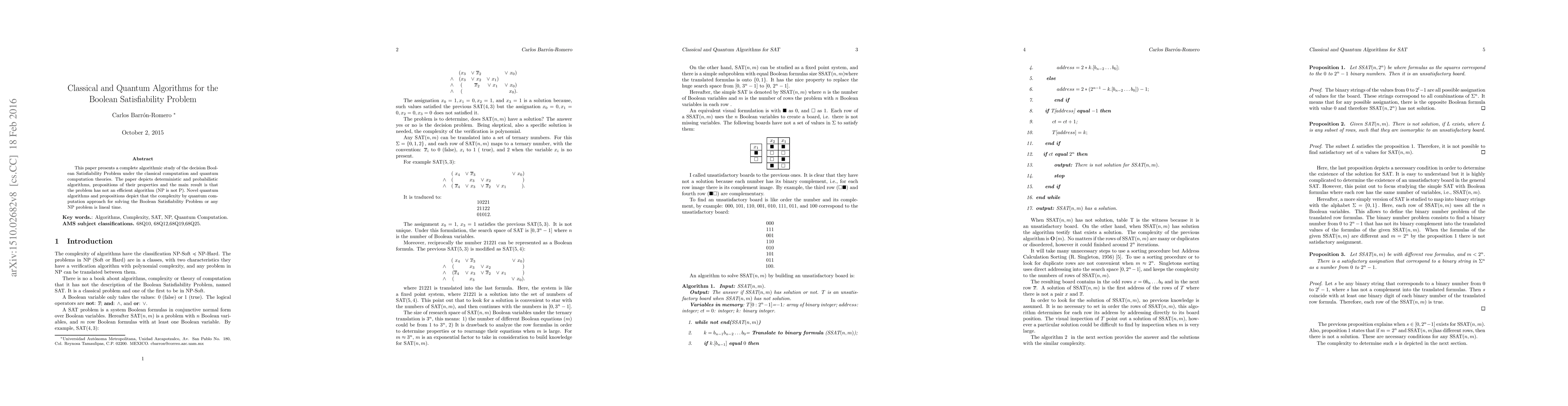 This paper explores classical and quantum algorithms for the Boolean Satisfiability Problem, concluding that no efficient algorithm exists (NP ≠ P). It also proposes that quantum computation can solve the problem in linear time, contrasting with classical approaches.