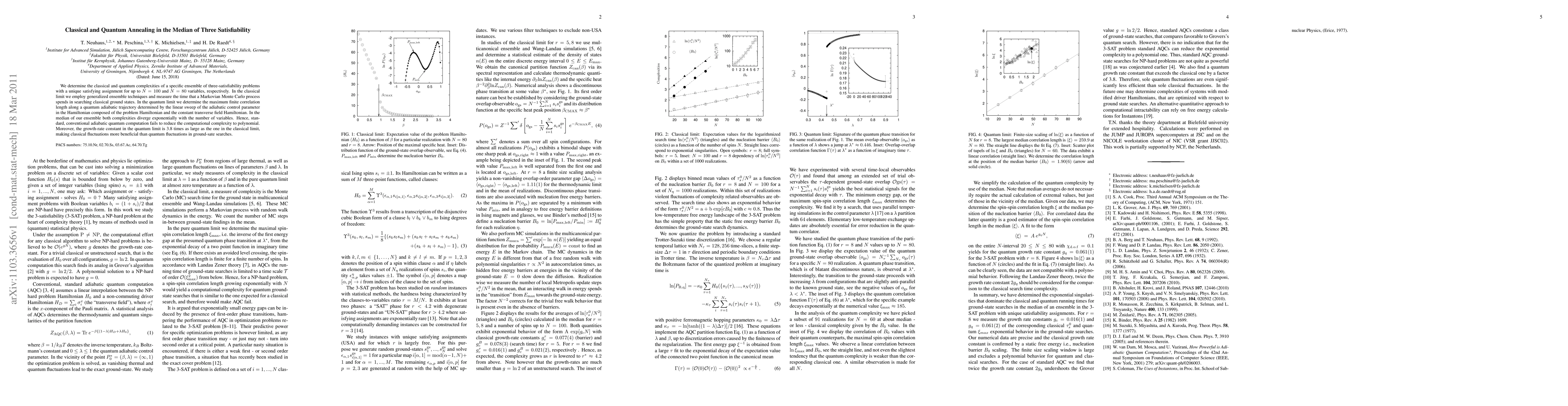 We determine the classical and quantum complexities of a specific ensemble of three-satisfiability problems with a unique satisfying assignment for up to N=100 and N=80 variables, respectively. In the classical limit we employ generalized ensemble techniques and measure the time that a Markovian Monte Carlo process spends in searching classical ground states. In the quantum limit we determine the maximum finite correlation length along a quantum adiabatic trajectory determined by the linear sweep of the adiabatic control parameter in the Hamiltonian composed of the problem Hamiltonian and the constant transverse field Hamiltonian. In the median of our ensemble both complexities diverge exponentially with the number of variables. Hence, standard, conventional adiabatic quantum computation fails to reduce the computational complexity to polynomial. Moreover, the growth-rate constant in the quantum limit is 3.8 times as large as the one in the classical limit, making classical fluctuations more beneficial than quantum fluctuations in ground-state searches.