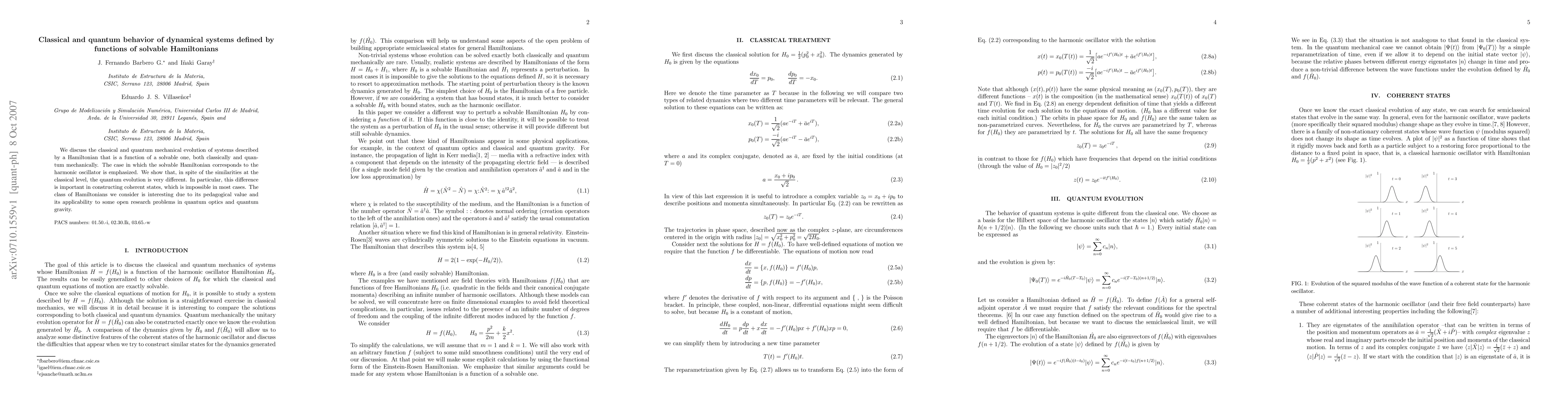 We discuss the classical and quantum mechanical evolution of systems described by a Hamiltonian that is a function of a solvable one, both classically and quantum mechanically. The case in which the solvable Hamiltonian corresponds to the harmonic oscillator is emphasized. We show that, in spite of the similarities at the classical level, the quantum evolution is very different. In particular, this difference is important in constructing coherent states, which is impossible in most cases. The class of Hamiltonians we consider is interesting due to its pedagogical value and its applicability to some open research problems in quantum optics and quantum gravity.