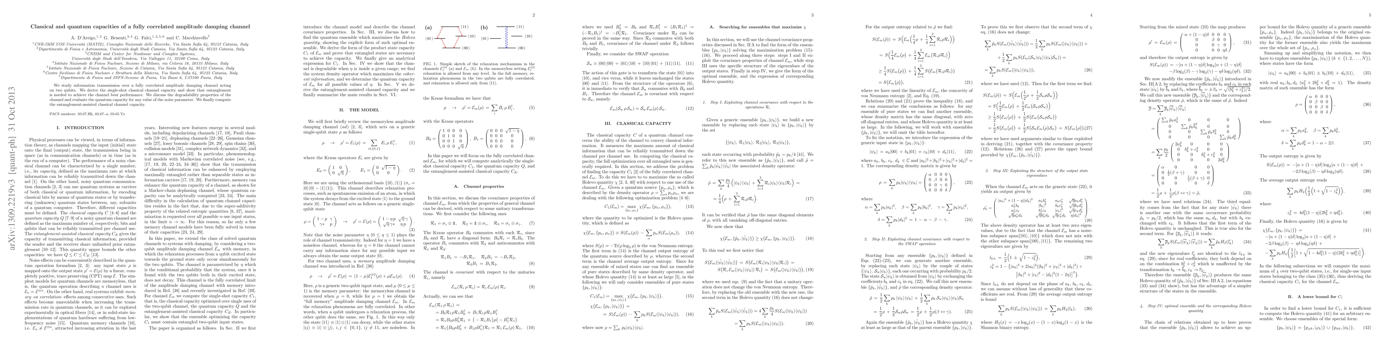 This paper investigates the classical and quantum capacities of a fully correlated amplitude damping channel for two qubits, demonstrating that entanglement is essential for optimal performance and evaluating the channel's degradability and quantum capacity across noise levels.