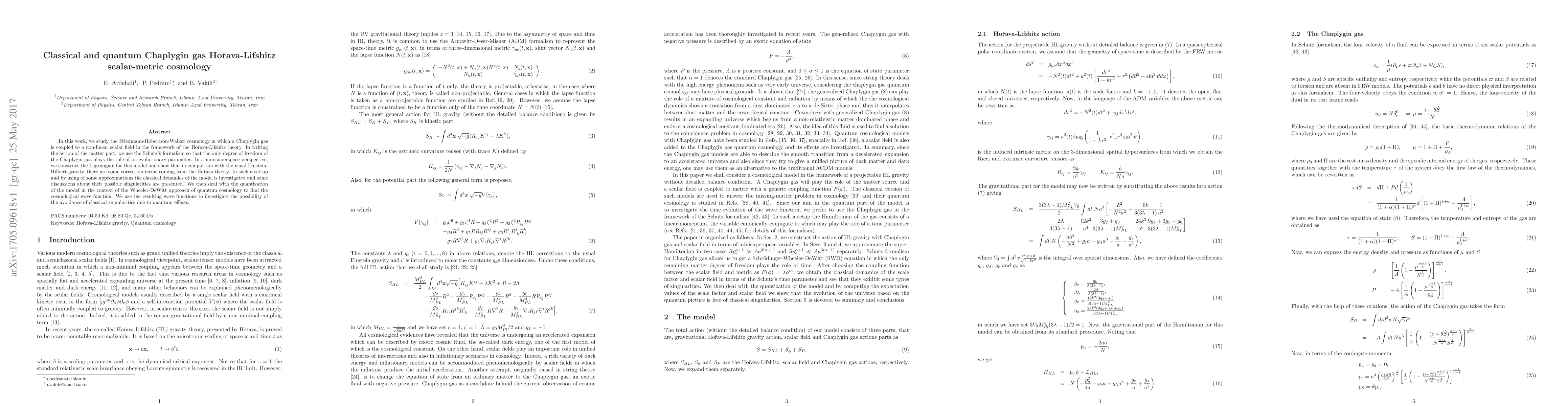 In this work, we study the Friedmann-Robertson-Walker cosmology in which a Chaplygin gas is coupled to a non-linear scalar field in the framework of the Ho\v{r}ava-Lifshitz theory. In writing the action of the matter part, we use the Schutz's formalism so that the only degree of freedom of the Chaplygin gas plays the role of an evolutionary parameter. In a minisuperspace perspective, we construct the Lagrangian for this model and show that in comparison with the usual Einstein-Hilbert gravity, there are some correction terms coming from the Ho\v{r}ava theory. In such a set-up and by using of some approximations the classical dynamics of the model is investigated and some discussions about their possible singularities are presented. We then deal with the quantization of the model in the context of the Wheeler-DeWitt approach of quantum cosmology to find the cosmological wave function. We use the resulting wave functions to investigate the possibility of the avoidance of classical singularities due to quantum effects.