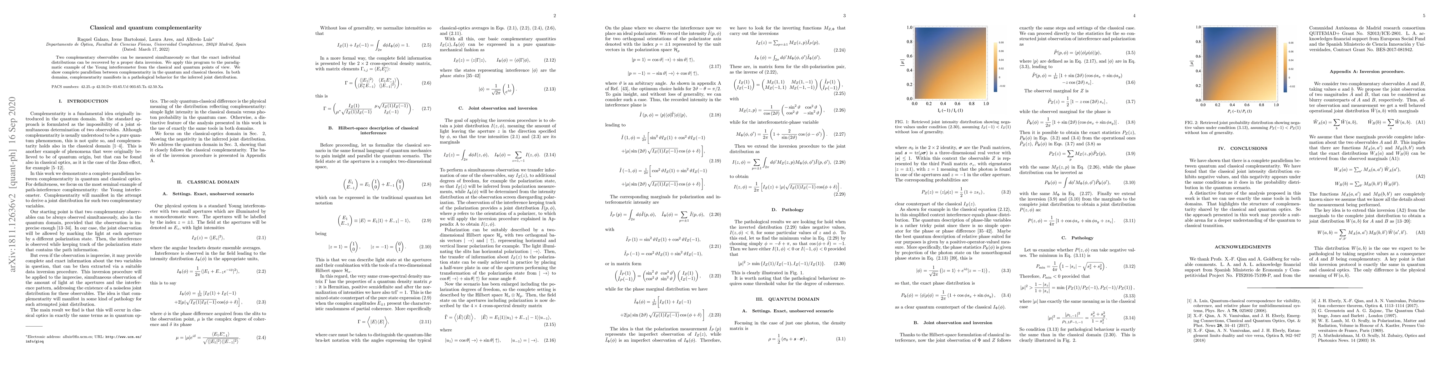 Two complementary observables can be measured simultaneously so that the exact individual distributions can be recovered by a proper data inversion. We apply this program to the paradigmatic example of the Young interferometer from the classical and quantum points of view. We show complete parallelism between complementarity in the quantum and classical theories. In both domains, complementarity manifests in a pathological behavior for the inferred joint distribution.