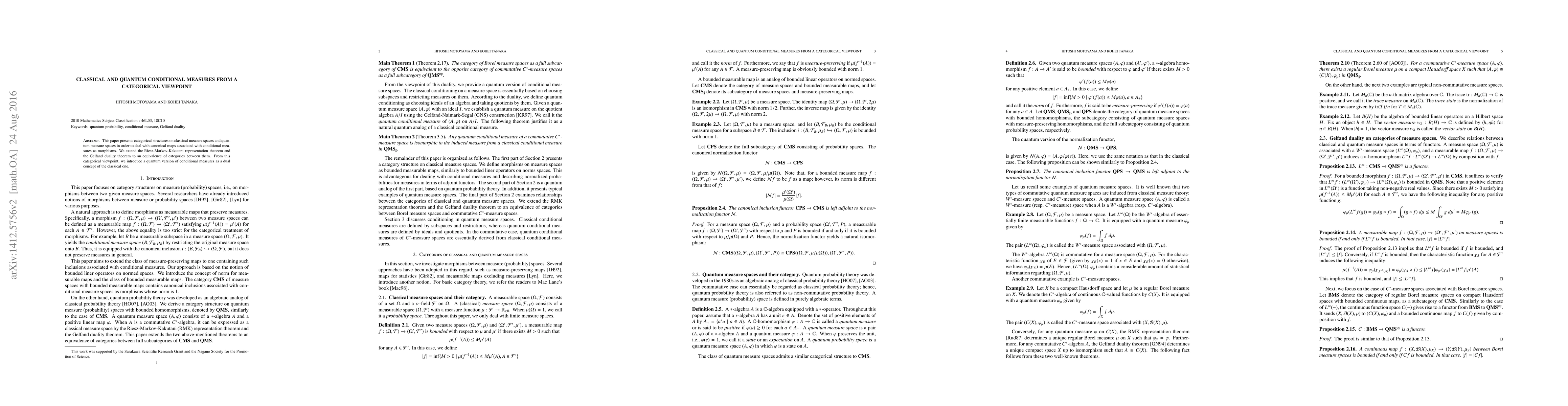 This paper explores the categorical structures of classical and quantum measure spaces, extending classical theorems to establish an equivalence of categories. It introduces a quantum version of conditional measures as dual to the classical concept.