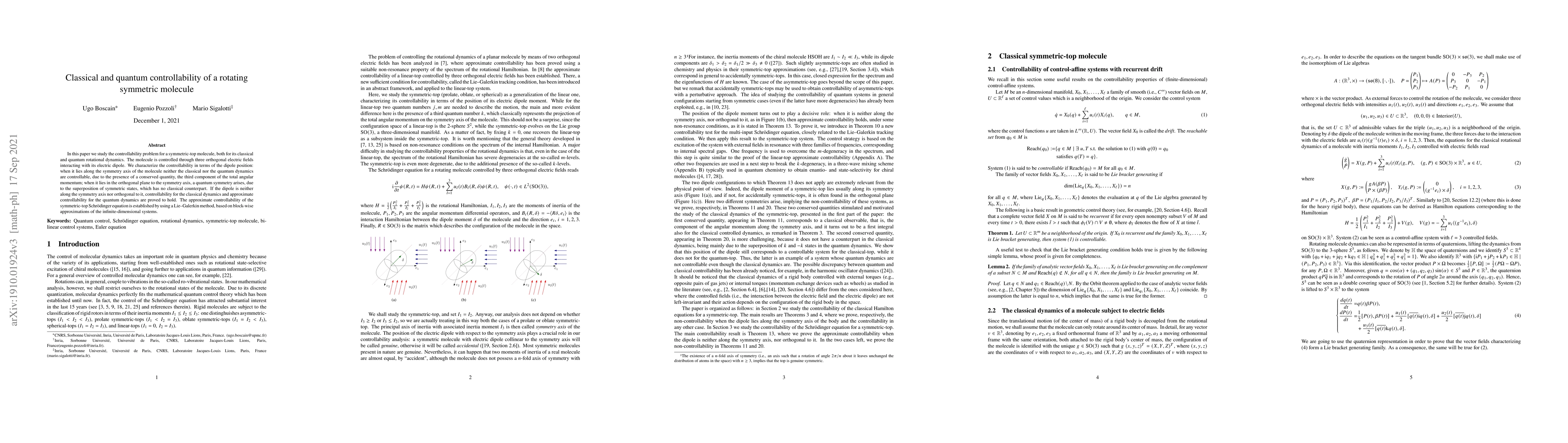 Researchers studied controllability of a rotating symmetric molecule using classical and quantum mechanics, finding that controllability depends on the dipole position relative to the molecule's symmetry axis.