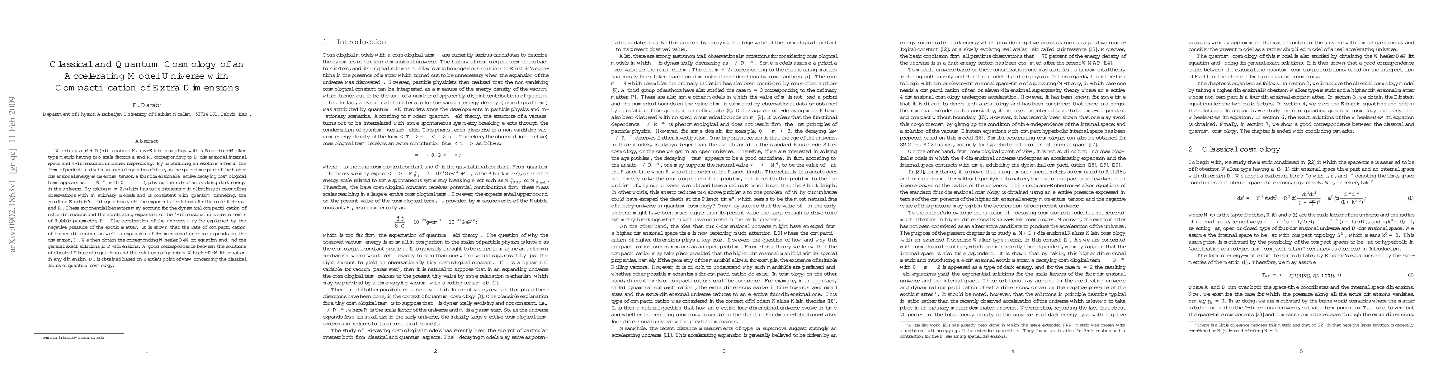 This paper explores a $(4+D)$-dimensional cosmology with compactification of extra dimensions using Kaluza-Klein theory, introducing an exotic perfect fluid to model evolving dark energy. The study finds exponential solutions for scale factors that explain the universe's accelerating expansion and the compactification of extra dimensions, with a good correspondence between classical and quantum cosmological solutions.