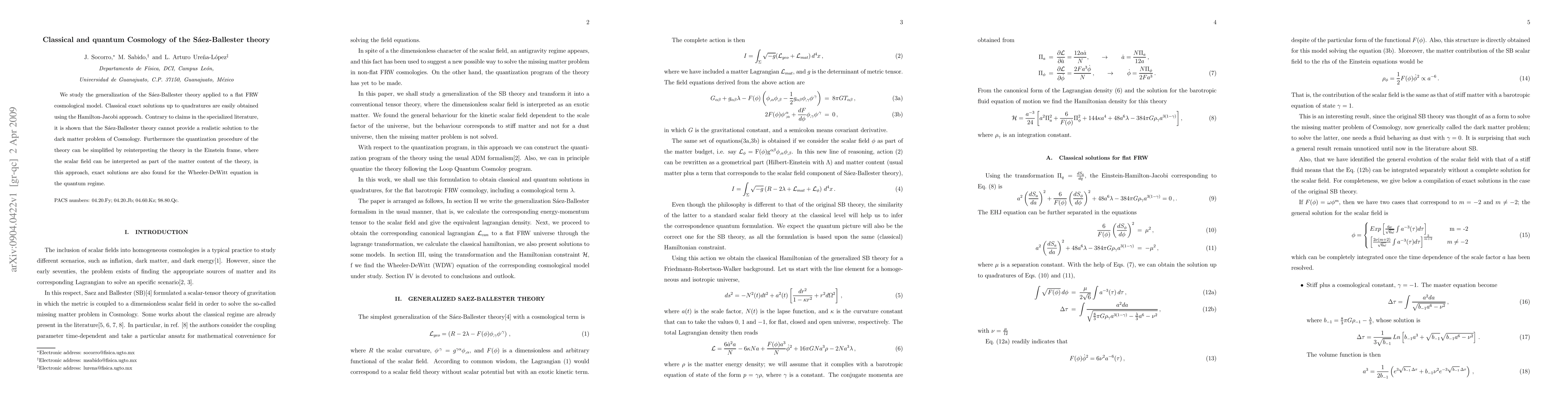 We study the generalization of the S\'aez-Ballester theory applied to a flat FRW cosmological model. Classical exact solutions up to quadratures are easily obtained using the Hamilton-Jacobi approach. Contrary to claims in the specialized literature, it is shown that the S\'aez-Ballester theory cannot provide a realistic solution to the dark matter problem of Cosmology. Furthermore the quantization procedure of the theory can be simplified by reinterpreting the theory in the Einstein frame, where the scalar field can be interpreted as part of the matter content of the theory, in this approach, exact solutions are also found for the Wheeler-DeWitt equation in the quantum regime.