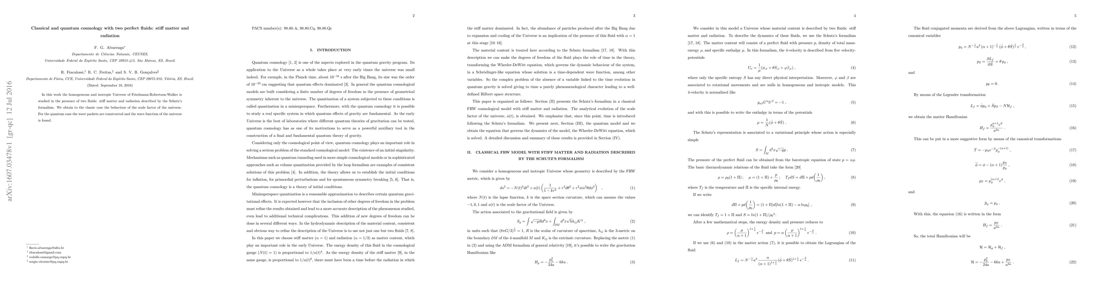 In this work the homogeneous and isotropic Universe of Friedmann-Robertson-Walker is studied in the presence of two fluids: stiff matter and radiation described by the Schutz's formalism. We obtain to the classic case the behaviour of the scale factor of the universe. For the quantum case the wave packets are constructed and the wave function of the universe is found.