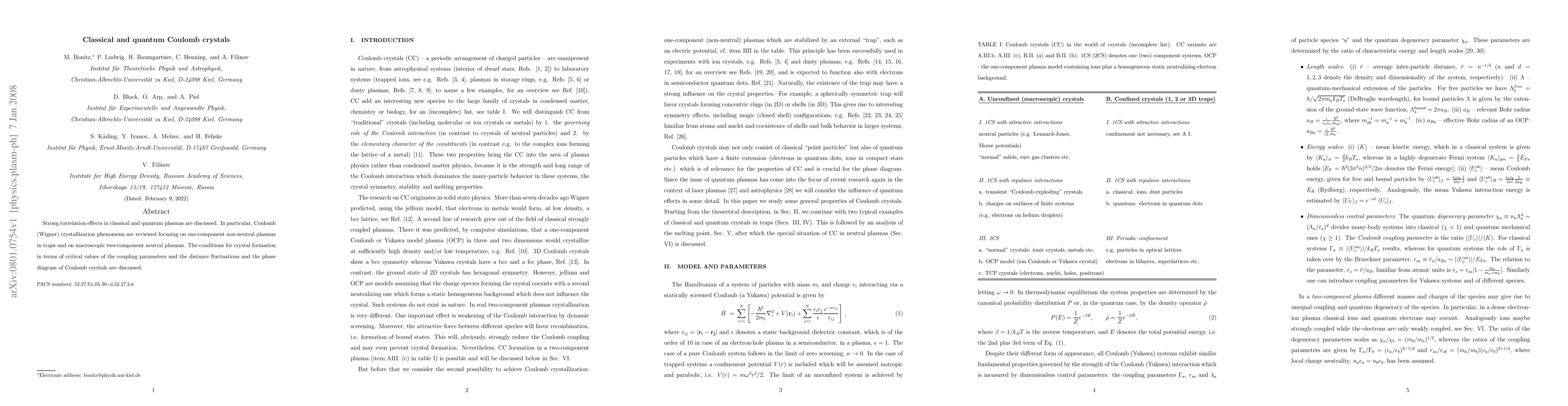 This paper reviews strong correlation effects in classical and quantum plasmas, focusing on the Coulomb crystallization phenomena in non-neutral and neutral plasmas. It discusses the conditions for crystal formation and the phase diagram of Coulomb crystals in terms of coupling parameters and distance fluctuations.