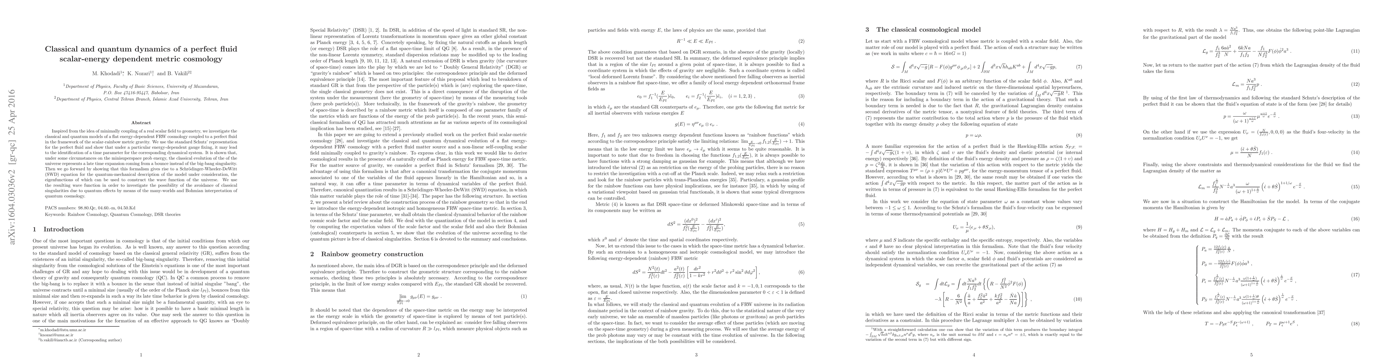 This paper explores classical and quantum dynamics in a scalar-rainbow metric cosmology with a perfect fluid, revealing a potential universe bounce instead of a big-bang singularity. It also derives a Schrödinger-Wheeler-DeWitt equation for the quantum model, suggesting quantum effects may avoid classical singularities.