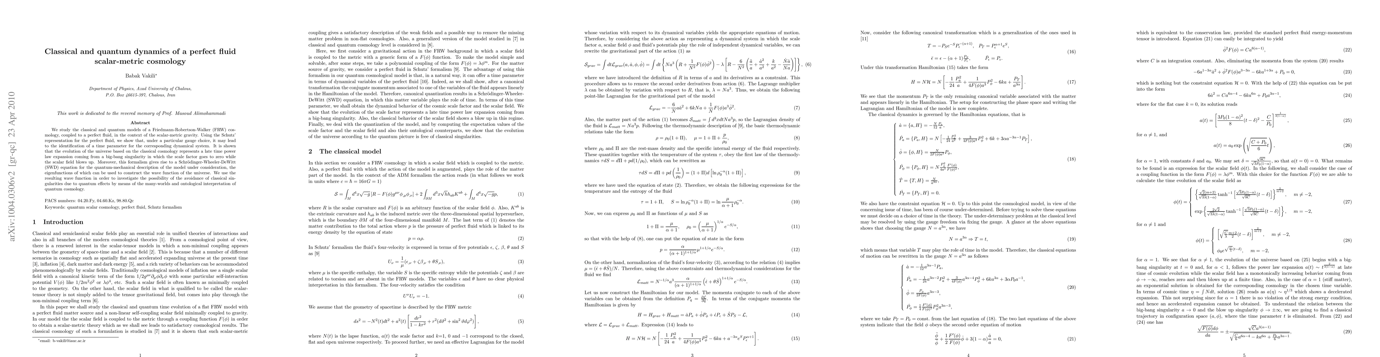 This paper explores classical and quantum dynamics in a scalar-metric gravity framework for a perfect fluid-coupled Friedmann-Robertson-Walker cosmology. It identifies a time parameter and shows a classical late-time expansion from a big-bang singularity, while proposing a Schrödinger-Wheeler-DeWitt equation to investigate quantum avoidance of classical singularities.