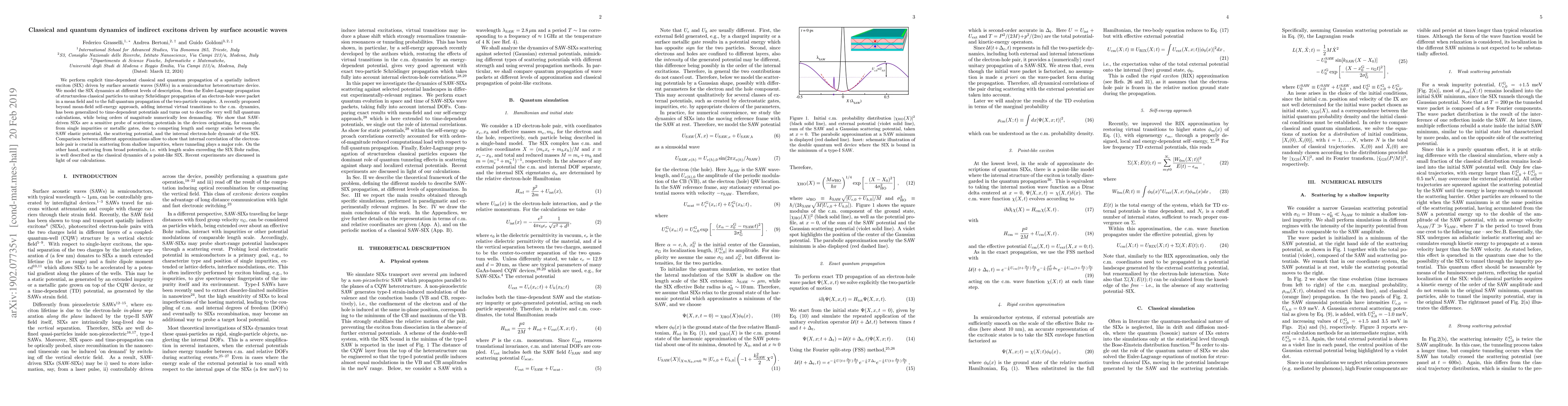 We perform explicit time-dependent classical and quantum propagation of a spatially indirect exciton (SIX) driven by surface acoustic waves (SAWs) in a semiconductor heterostructure device. We model the SIX dynamics at different levels of description, from the Euler-Lagrange propagation of structureless classical particles to unitary Schr\"odinger propagation of an electron-hole wave packet in a mean field and to the full quantum propagation of the two-particle complex. A recently proposed beyond mean-field self-energy approach, adding internal virtual transitions to the c.m. dynamics, has been generalized to time-dependent potentials and turns out to describe very well full quantum calculations, while being orders of magnitude numerically less demanding. We show that SAW-driven SIXs are a sensitive probe of scattering potentials in the devices originating, for example, from single impurities or metallic gates, due to competing length and energy scales between the SAW elastic potential, the scattering potential, and the internal electron-hole dynamic of the SIX. Comparison between different approximations allow us to show that internal correlation of the electron-hole pair is crucial in scattering from shallow impurities, where tunneling plays a major role. On the other hand, scattering from broad potentials, i.e., with length scales exceeding the SIX Bohr radius, is well described as the classical dynamics of a pointlike SIX. Recent experiments are discussed in light of our calculations.