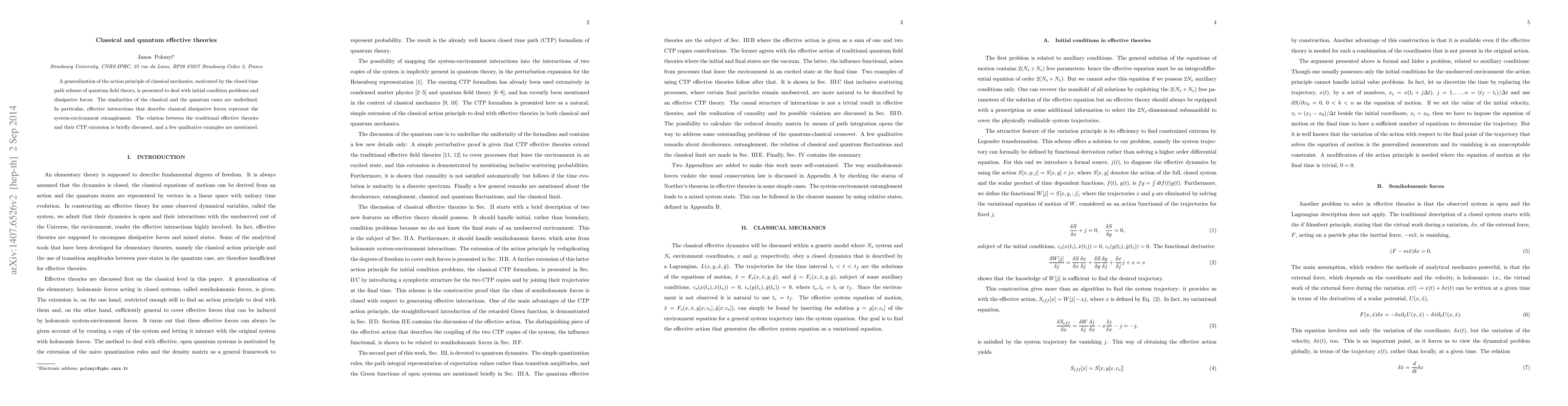 A generalization of the action principle of classical mechanics, motivated by the Closed Time Path (CTP) scheme of quantum field theory, is presented to deal with initial condition problems and dissipative forces. The similarities of the classical and the quantum cases are underlined. In particular, effective interactions which describe classical dissipative forces represent the system-environment entanglement. The relation between the traditional effective theories and their CTP extension is briefly discussed and few qualitative examples are mentioned.