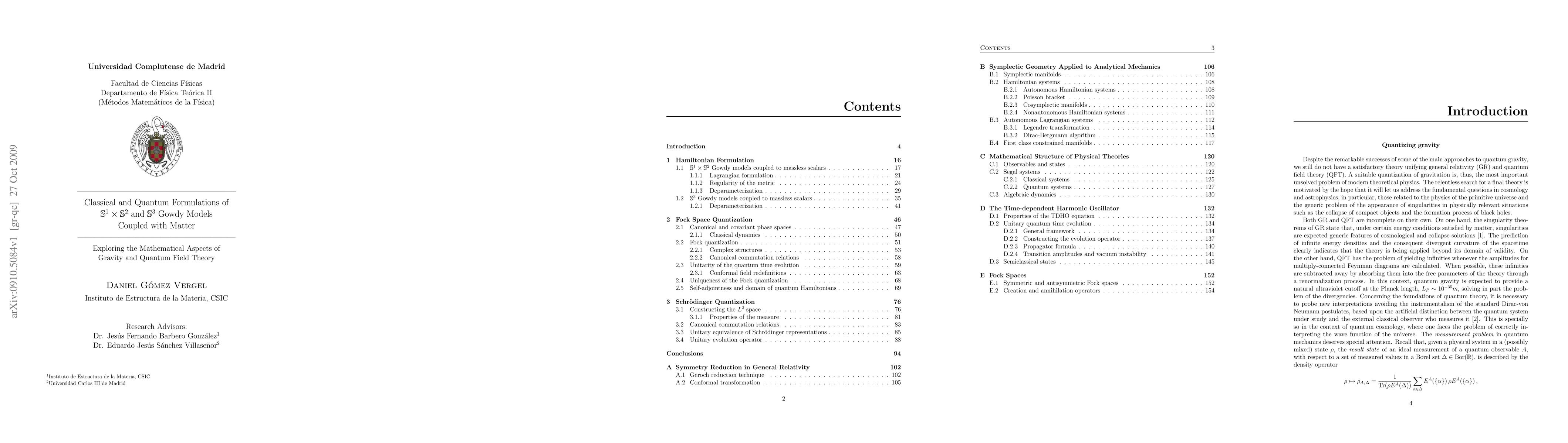 We explore the features of gravity in its quantum regime in a mathematically rigorous way by carrying out the classical and quantum formulations of some two-Killing symmetry reductions of general relativity which admit an exact Fock/Schr\"{o}dinger quantization. Concretely, we analyze in depth the linearly polarized 3-handle (S1xS2) and 3-sphere (S3) Gowdy cosmological models coupled to massless scalar fields. Within the classical formulation, this study requires a careful application of modern differential geometry techniques and the Dirac-Bergmann theory of constrained systems. Regarding the quantization process, we analyze the construction of both Fock and Schr\"{o}dinger representations, the unitarity of the time evolution, and the existence of semiclassical states for these systems by making use of the algebraic formalism of quantum theory and the theory of unitary implementation of symplectic transformations. Several appendices give additional information on the results attained in the main body of the thesis, going deeply into the relevant mathematical aspects of the text.