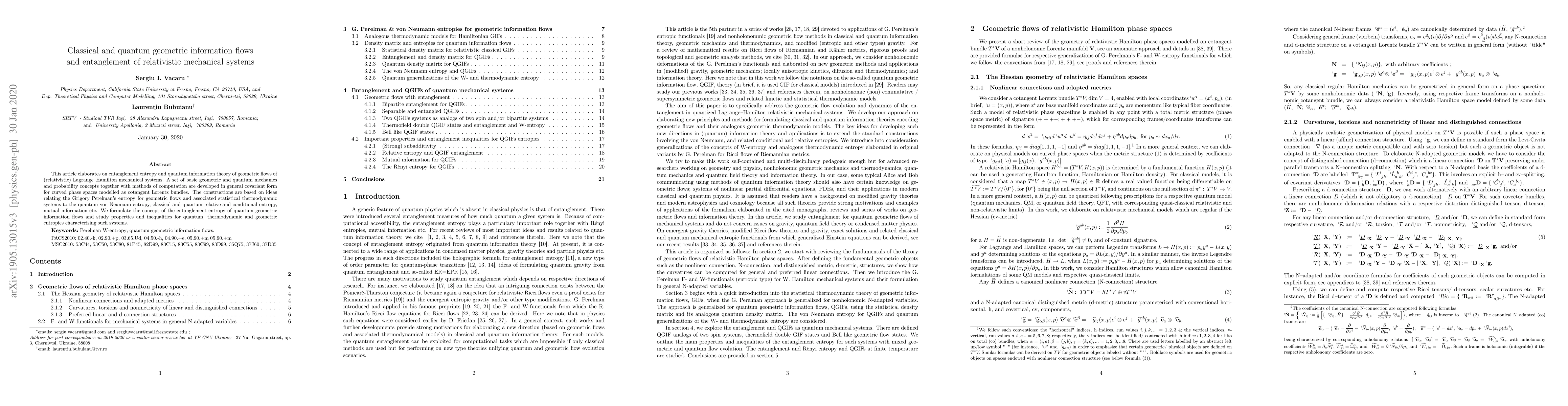 This paper develops a framework for understanding entanglement in relativistic mechanical systems through geometric flows, linking classical and quantum information theory. It formulates the entanglement entropy of quantum geometric information flows and explores properties and inequalities of associated quantum, thermodynamic, and geometric entropies.
