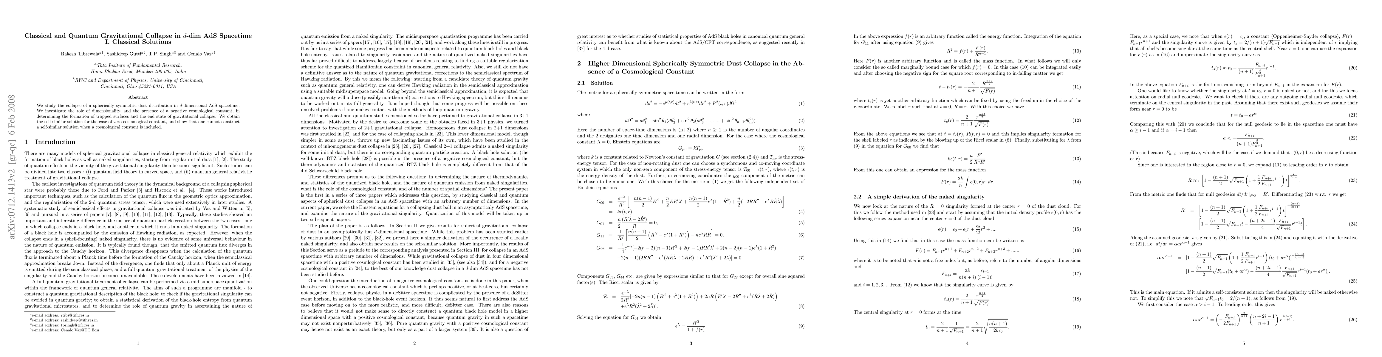 We study the collapse of a spherically symmetric dust distribution in $d$-dimensional AdS spacetime. We investigate the role of dimensionality, and the presence of a negative cosmological constant, in determining the formation of trapped surfaces and the end state of gravitational collapse. We obtain the self-similar solution for the case of zero cosmological constant, and show that one cannot construct a self-similar solution when a cosmological constant is included.